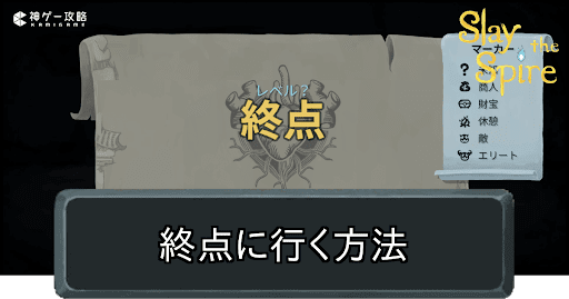 Slay the Spire(スレイザスパイア)の終点(レベル?)に行く方法を紹介。終点を攻略するコツについても掲載しているので、Slay the Spireで終点に行くための参考にどうぞ。