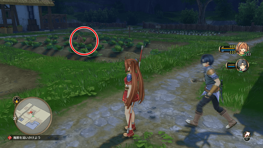 夜になったら、パーゼル農園の見回りを始めよう。温室と牧場を調べ、畑エリアに近づくと、キャベツ畑に魔獣が出現する。