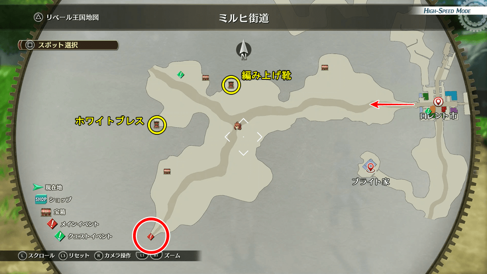 宝箱から入手できる重要アイテム 編み上げ靴 ホワイトブレス ロレント市の大通り西側からミルヒ街道へ出て、南西にあるパーゼル農園を目指そう。道中、宝箱から装備類を入手できるので、宝箱を開けながら進むのがおすすめだ。動いている宝箱には魔獣が入っており、倒すと中のアイテムを入手できる。