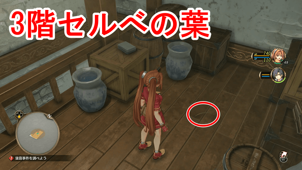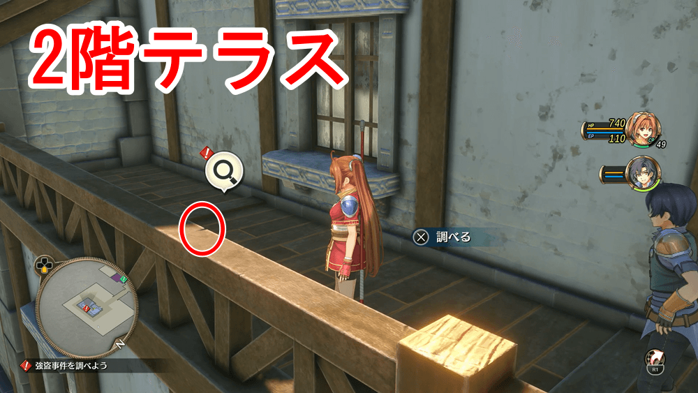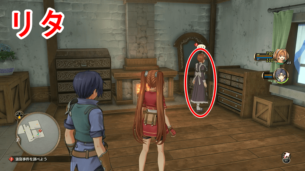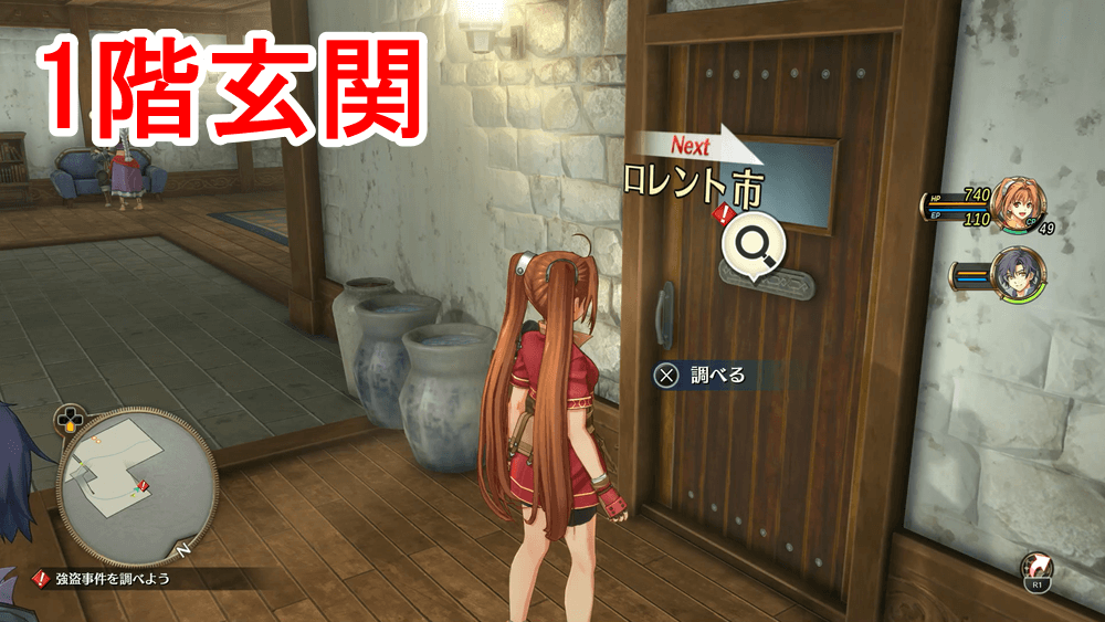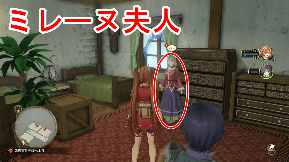 調査対象一覧 「市長邸の強盗事件」開始後、自動で市長邸まで移動するので、マーカーの場所をすべて調べて強盗の手がかりを探そう。「市長部屋の金庫」「2階テラスの手すり」「ミレーヌ夫人」「リタ」「3階セルべの葉」「1階玄関」を調べれば完了だ。