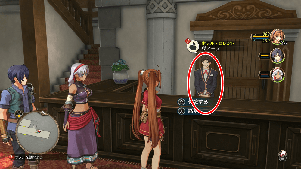 ホテルへ向かい、受付のヴィーノから話を聞こう。これ以降、序章クリアまでシェラザードがパーティに加わる。シェラザードは、最初から複数のアーツやクラフトを習得しているため、序章ではメイン火力として使うのが良い。