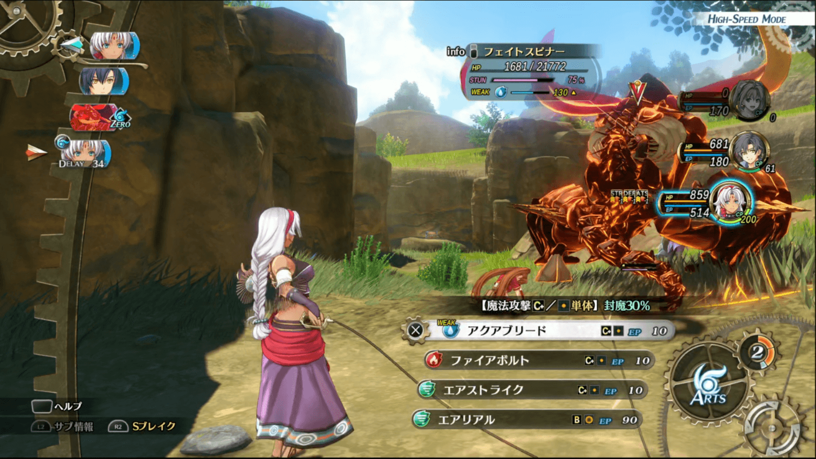 フェイトスピナーは水属性が弱点なので、水属性のアーツが使える場合は積極的に使おう。ただし、アーツを選択してから発動までに時間差があるため、HPに余裕を持った状態で使うと良い。