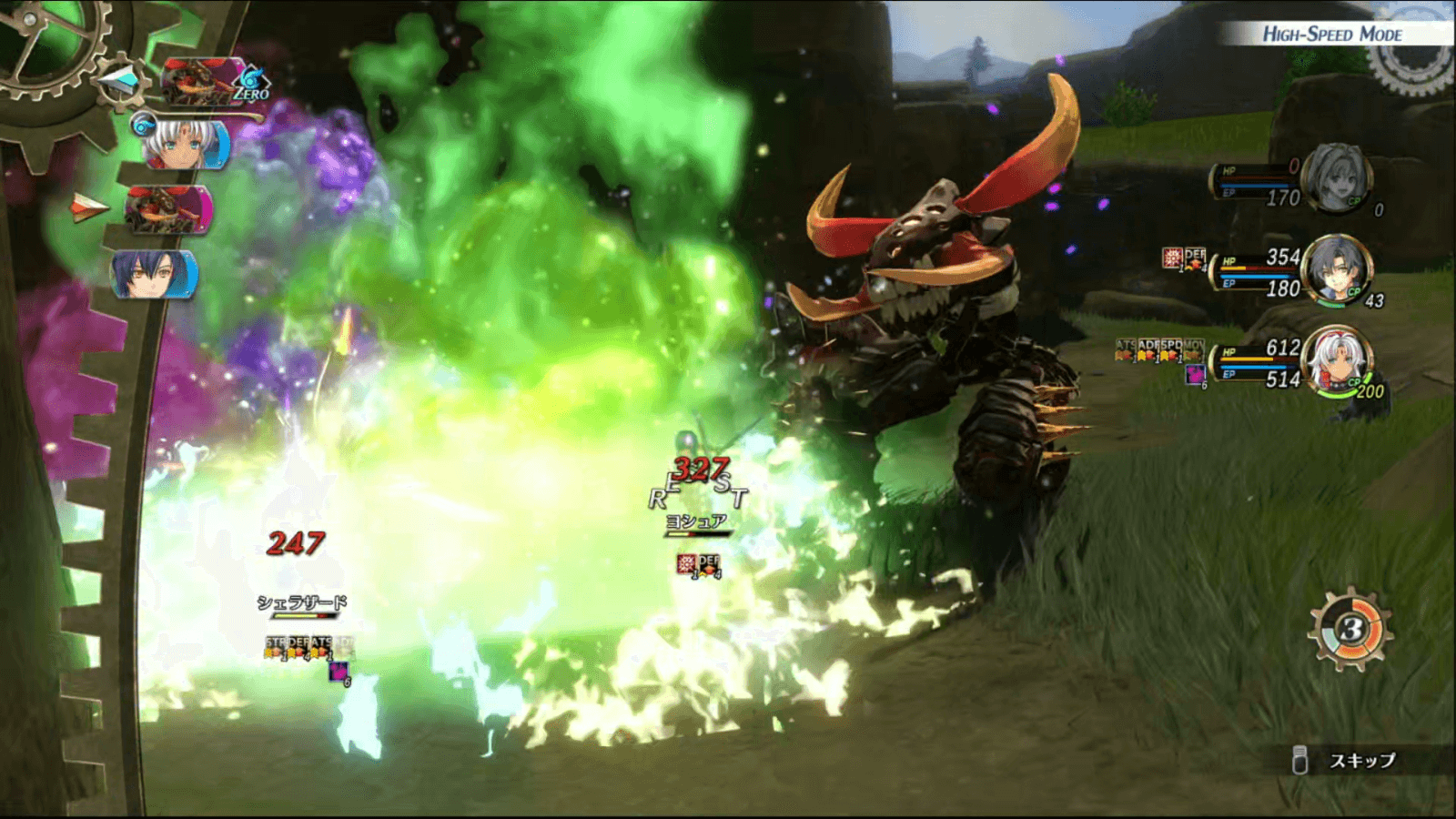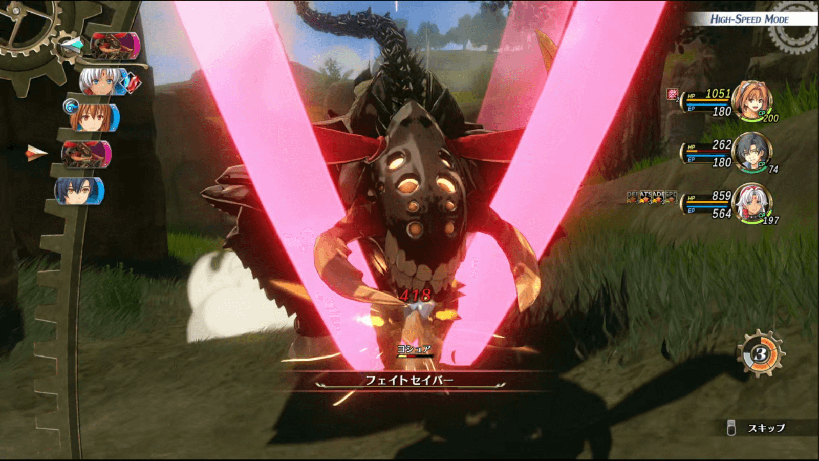 フェイトスピナーは単体攻撃がメインだが、1方向に固まっているとブレスによる範囲攻撃を行うので、3方向に散らばって戦おう。また、耐久力を上げるために、エステルの「掛け声」を使うと安定して戦える。