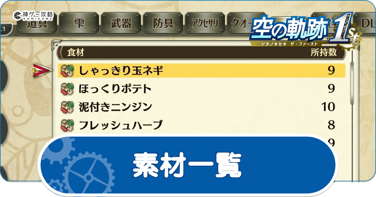 空の軌跡 the 1st の「素材」を解説。空の軌跡リメイクの素材の入手方法や効果を一覧で掲載しています。