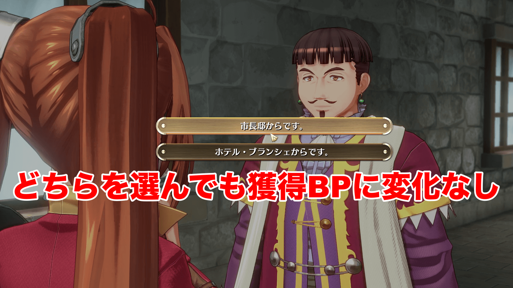 公爵との会話シーンでは、BP上昇に関わる選択肢が3回出現する。3つの選択肢ですべて正解を選ばないとBPが上昇しないため、正確に回答しよう。