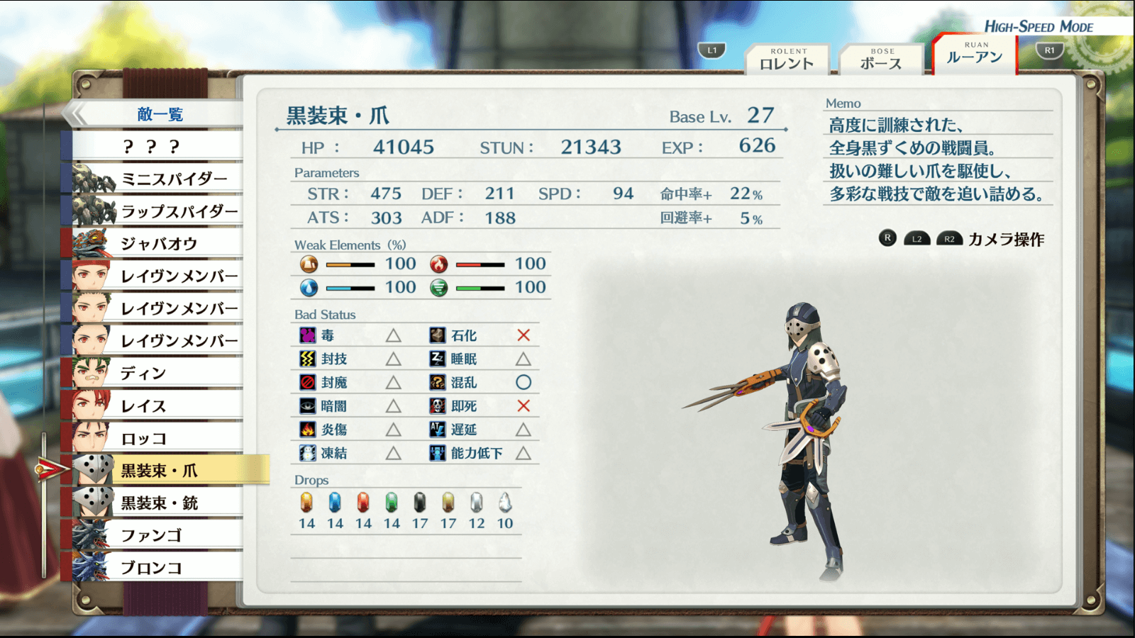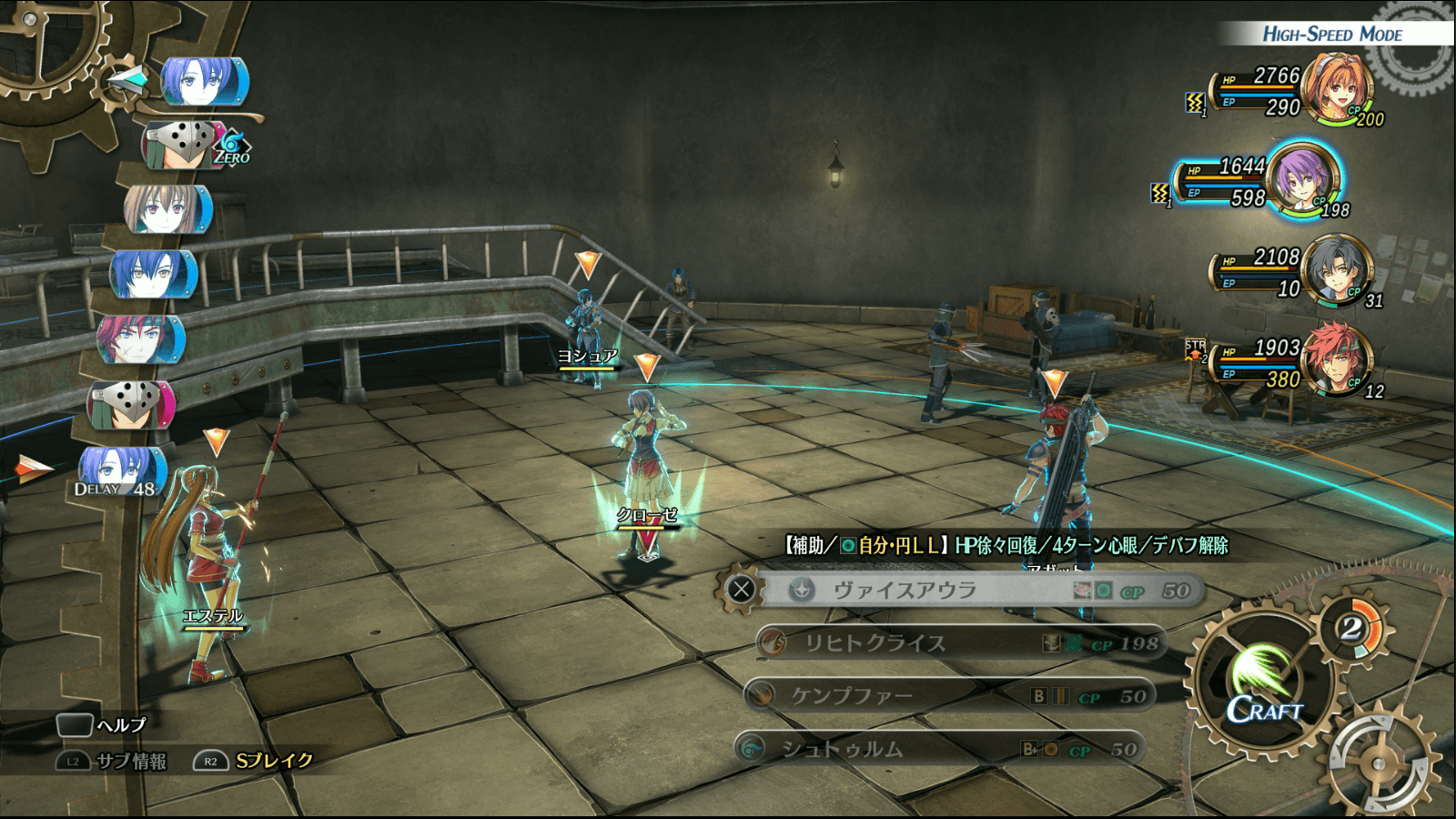 黒装束は2体とも物理攻撃が中心なので、回避しやすくなる心眼が非常に有効だ。心眼はアーツ「シルフェンウィング」のほか、クローゼのクラフト「ヴァイスアウラ」でも付与できる。敵はクラフトを封じる封技を使うため、両方用意しておくと安心だ。
