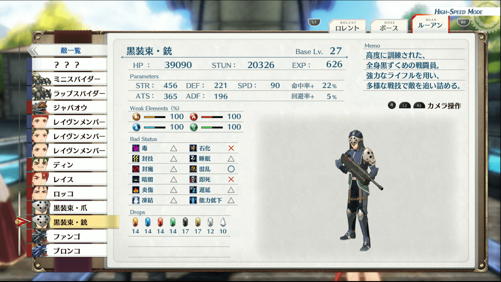 黒装束・銃の攻撃で能力低下を付与してくるため、能力低下を解除するアーツを用意しておこう。「シルフェンウィング」の心眼付与や「クレスト」でHP回復とDEF上昇など、追加で強い効果が付いたアーツがおすすめだ。