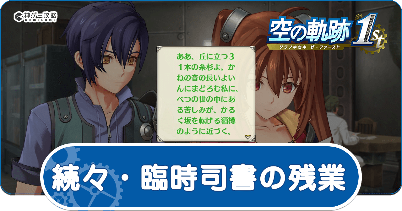 空の軌跡 the 1st のサブクエスト「続々・臨時司書の残業」を解説。空の軌跡リメイクの続々・臨時司書の残業の攻略チャート、続々・臨時司書の残業の場所、受注時期や受注場所、失敗条件や報酬について掲載しています。