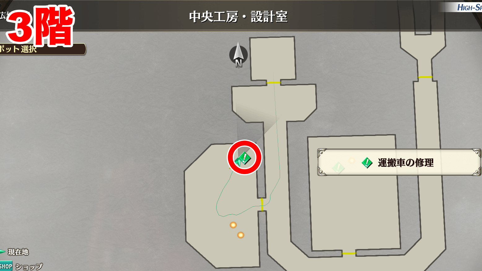 マップ 外観 検索の手順 1 中央工房関連 2 関連情報検索 3 運搬車 中央工房5階の演算室で、「運搬車」について調べよう。中央工房関連→関連情報検索→運搬車の順番で選択すれば、運搬車の情報を引き出せる。
