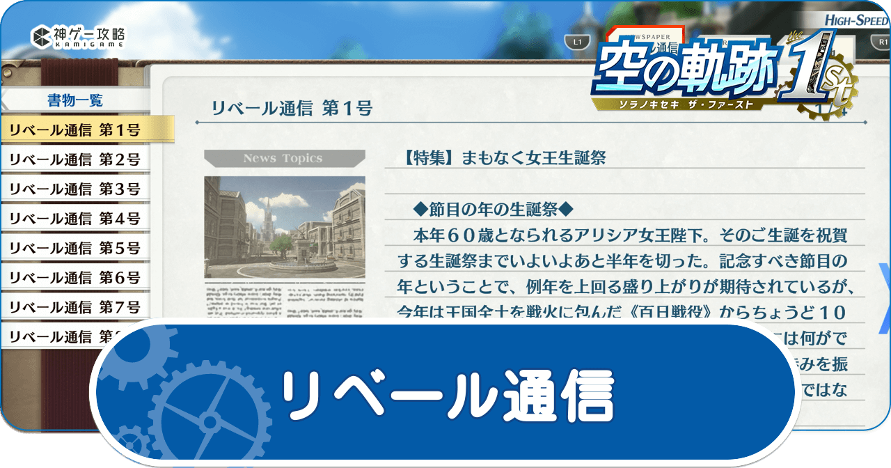 空の軌跡 the 1st の「リベール通信」を解説。空の軌跡リメイクのリベール通信の入手場所や章ごとに購入できる号数、トロフィーについて掲載しています。