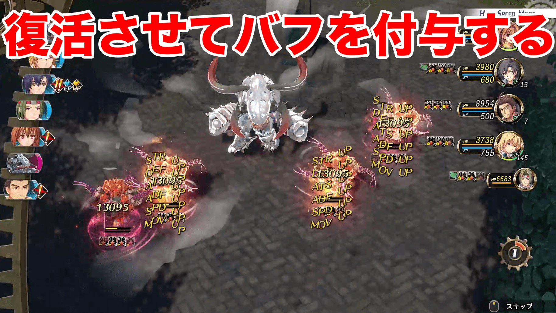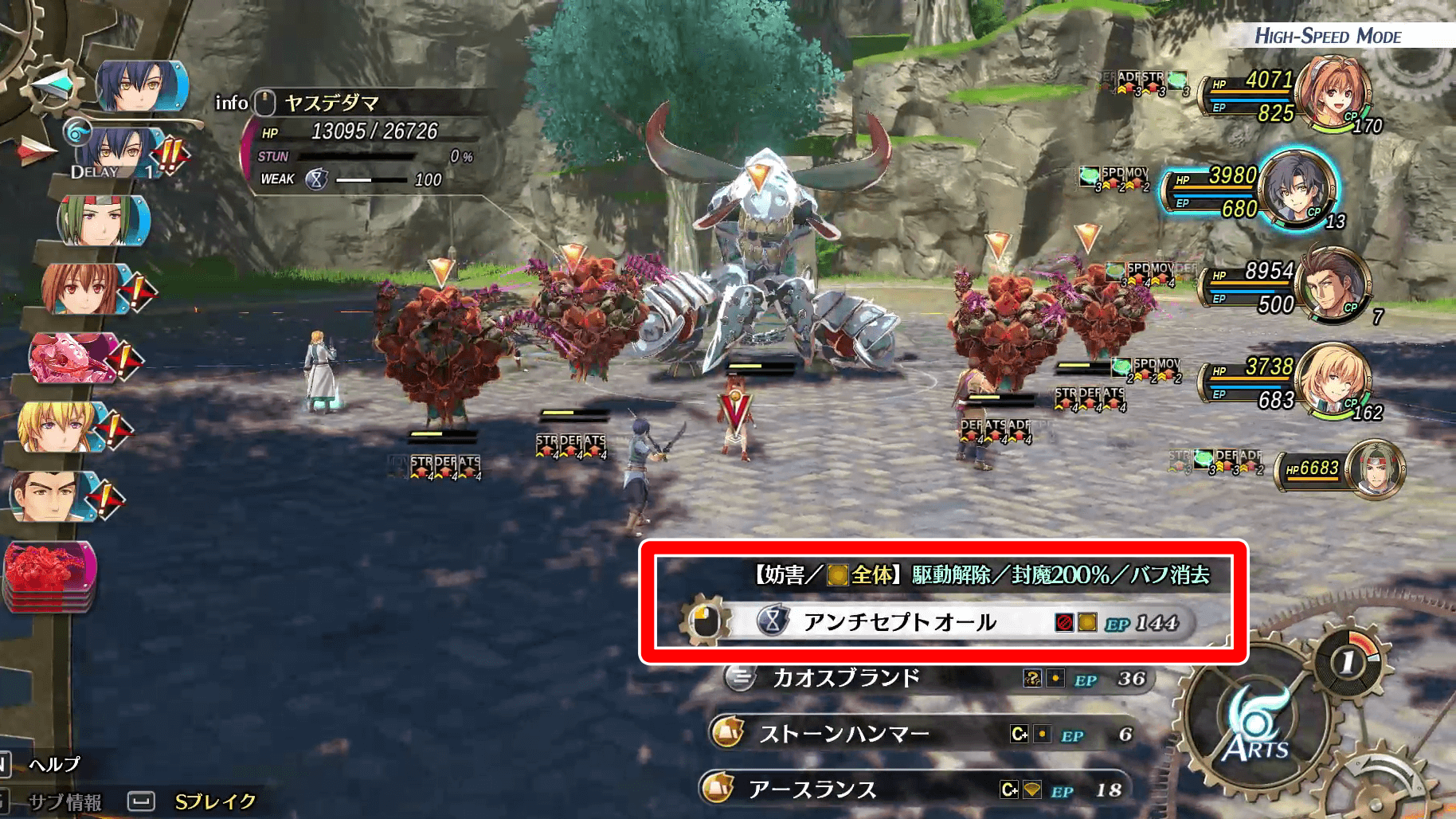 ハイドゥスピナーが付与する全体バフは最優先で解除しよう。アーツの「アンチセプトオール」を使って、全体のバフ消去を行うのが良い。
