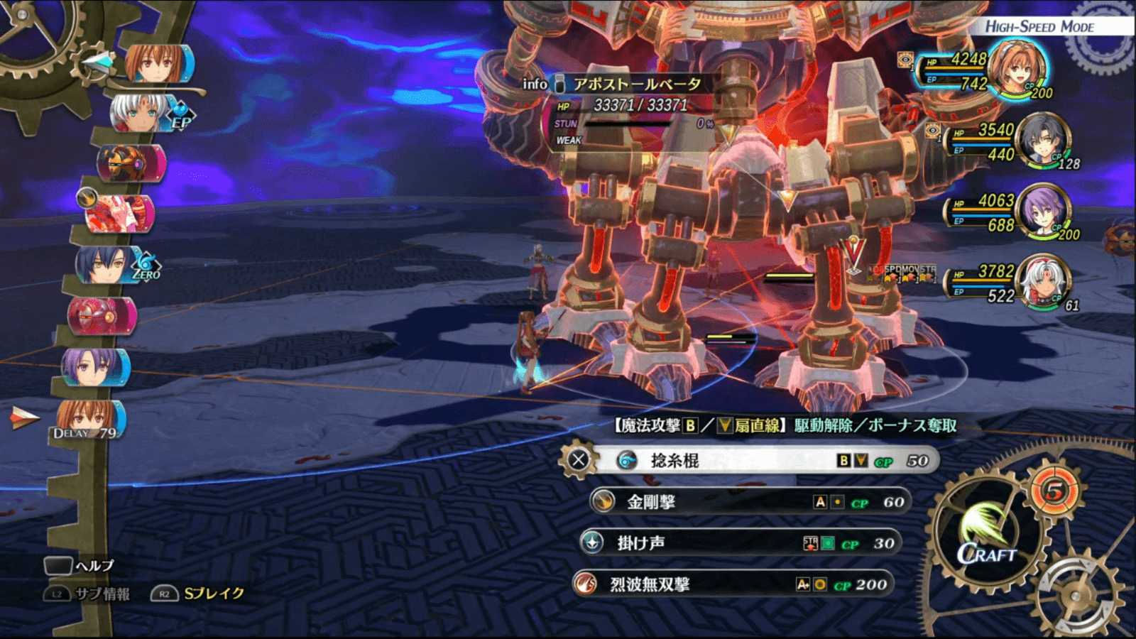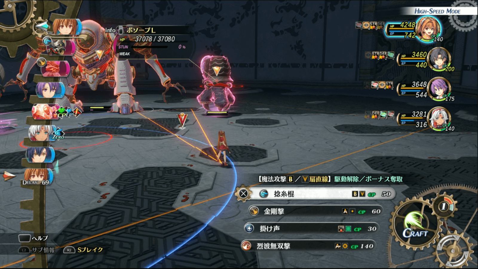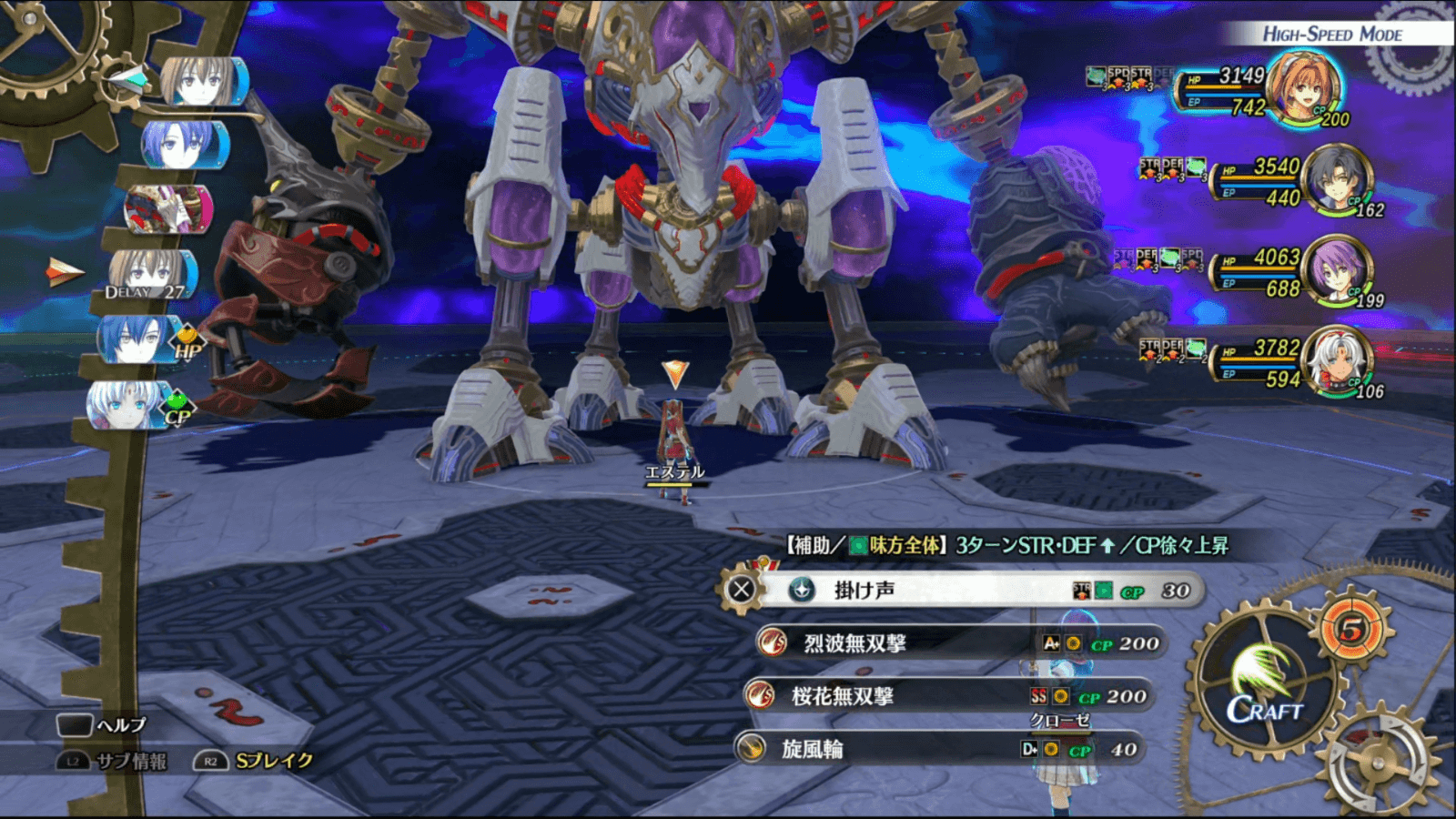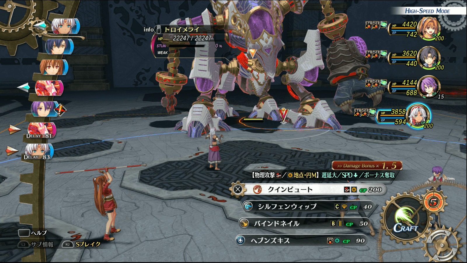 相手のアーツ駆動や物理攻撃の対策に、加速や心眼のバフを用意しておこう。クラフトで心眼や加速を付与しても良いが、CPはなるべく攻撃用のクラフトに回したいので、代用できるバフはアーツで付与するのがおすすめだ。