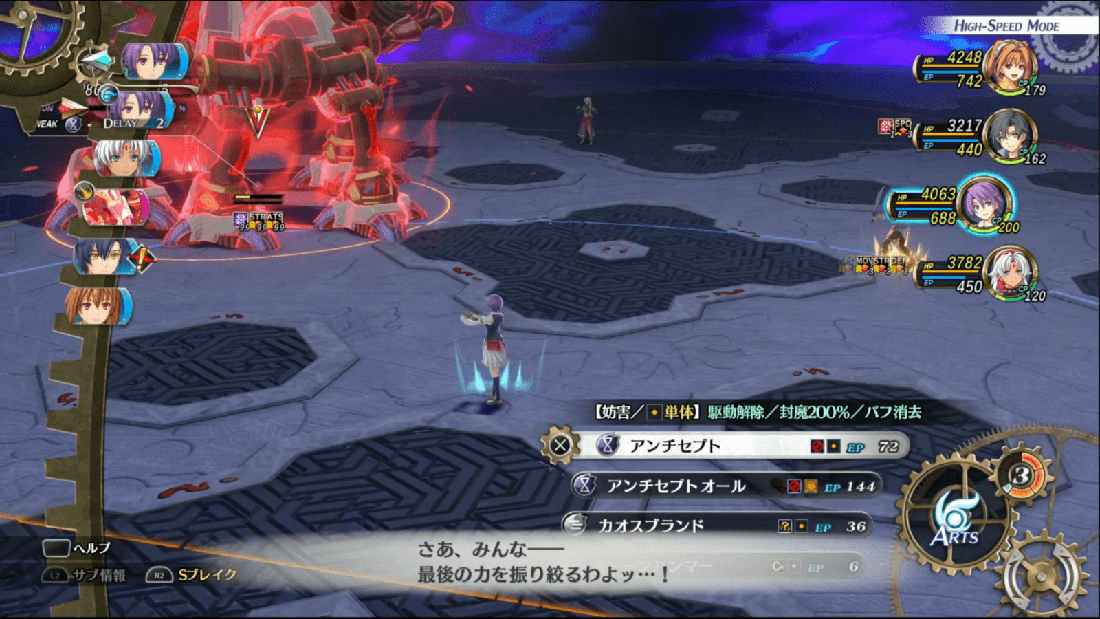 トロイメライは、アーツ駆動の動作後に全体大ダメージの「ジェノサイド・アーク」を使ってくるので、必ず解除しよう。行動タイミング的に間に合わなくても防御バフを保っているなら倒れはしないが、全体回復等で立て直しが必要になる。