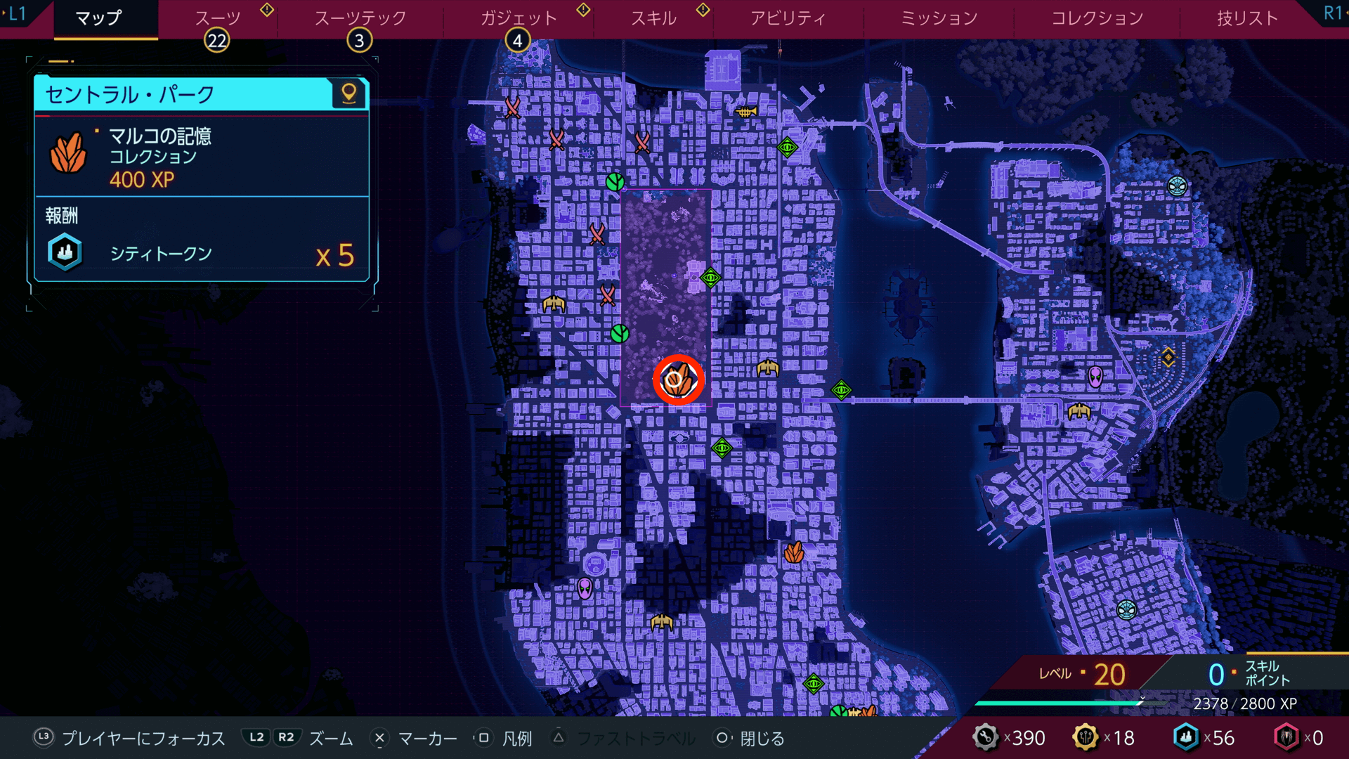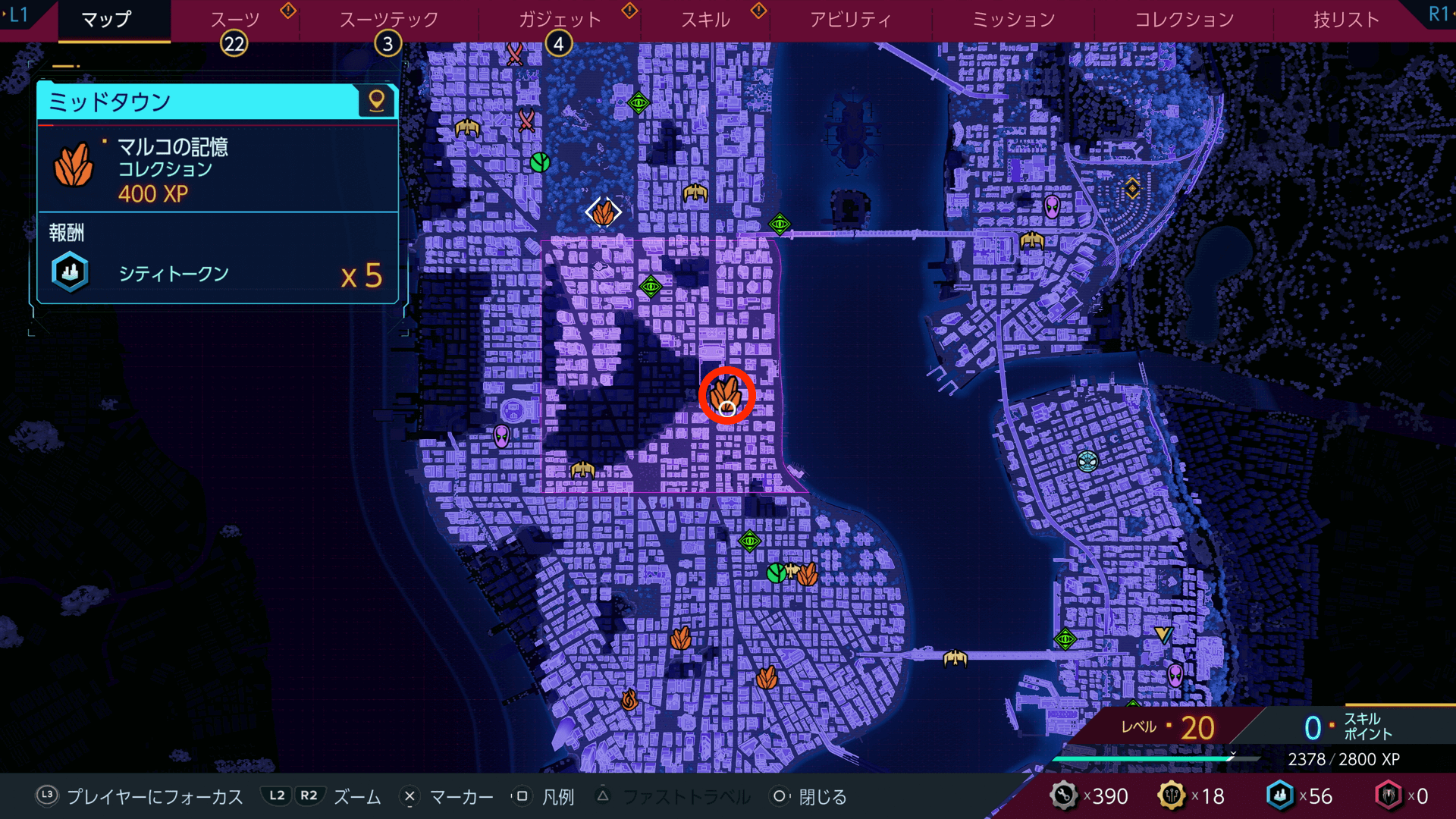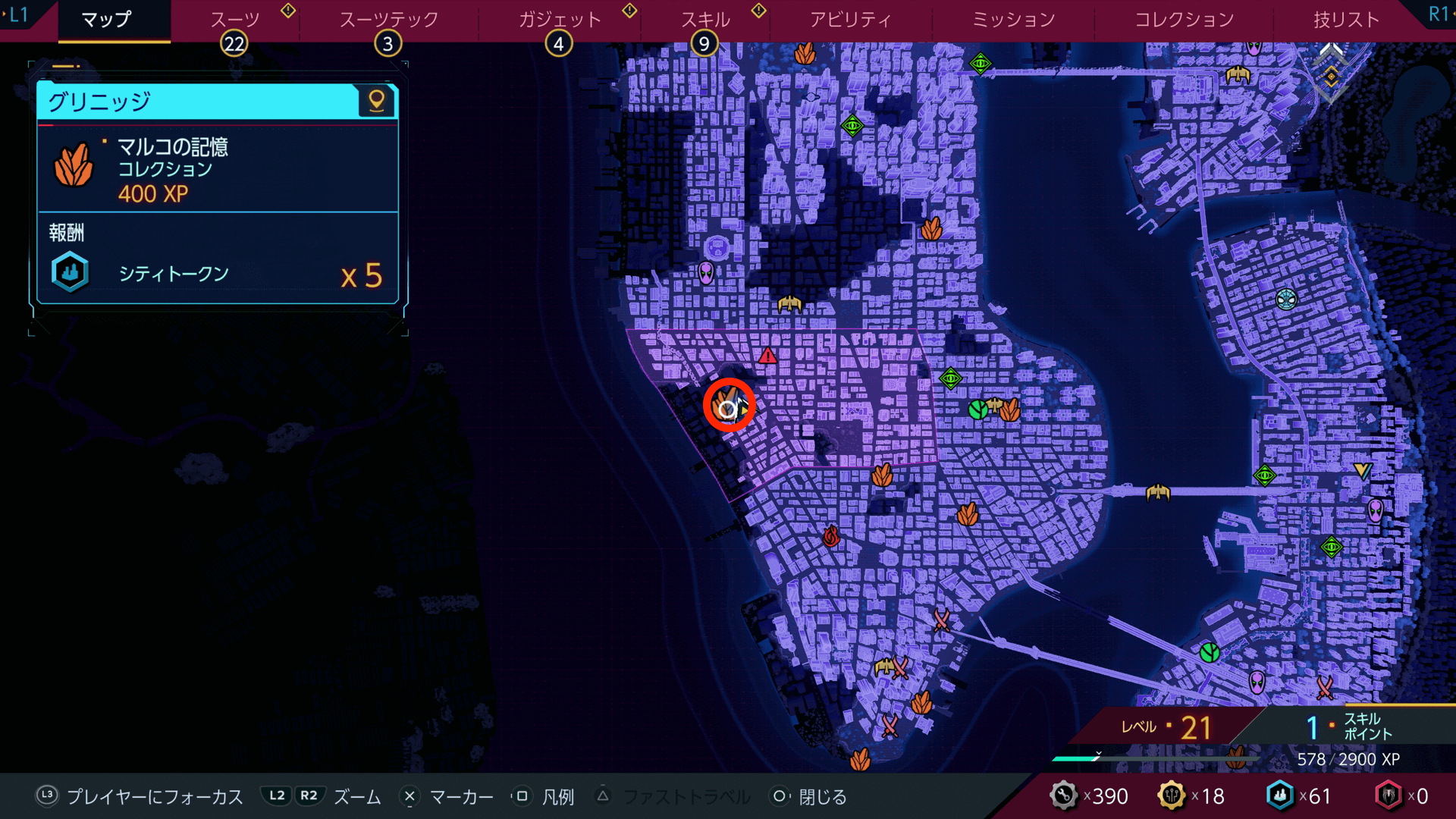 マルコの記憶をクリアすると、1箇所につき400XPとシティトークンを5個入手できる。シティトークンは、スーツテックやガジェットの強化に必要であるため、シティトークンを集めればスパイダーマンを強化可能だ。