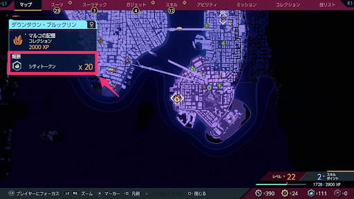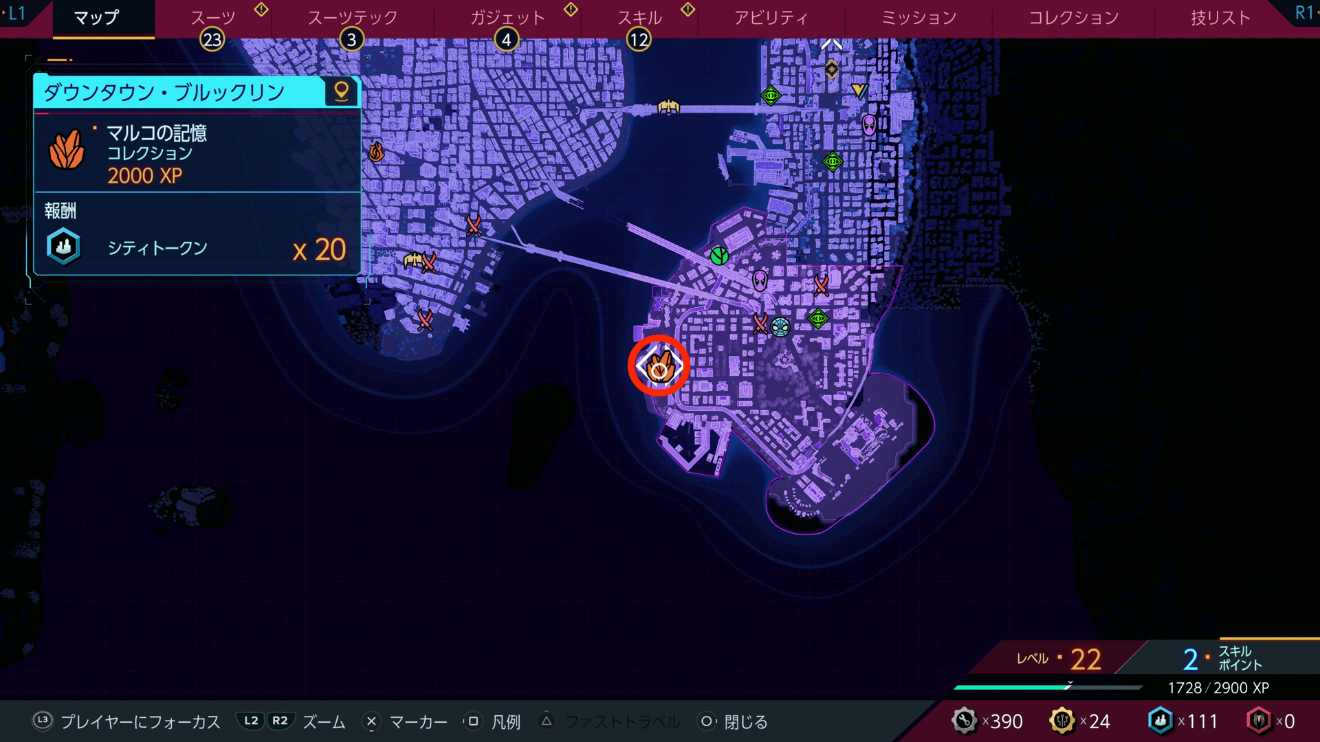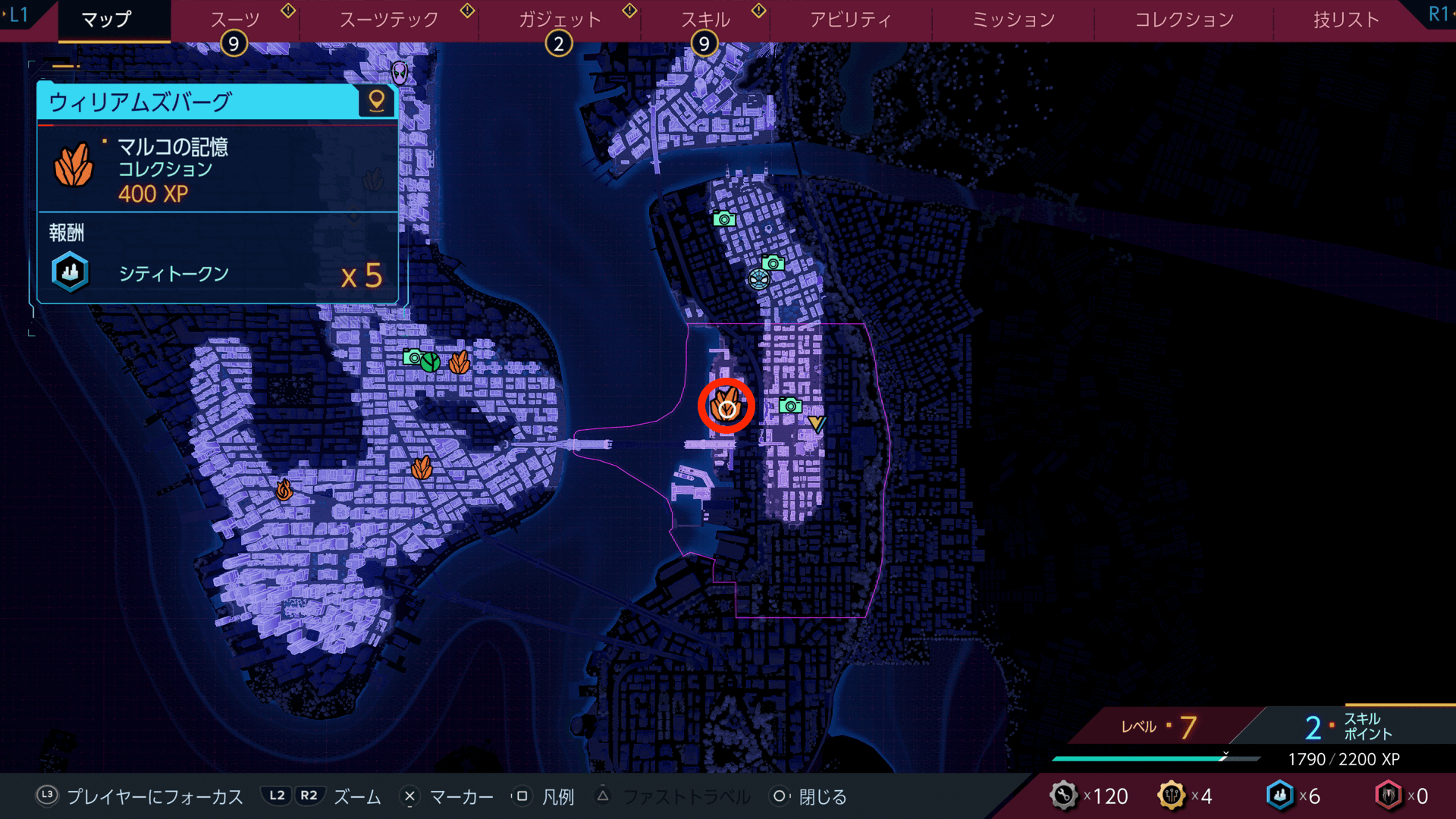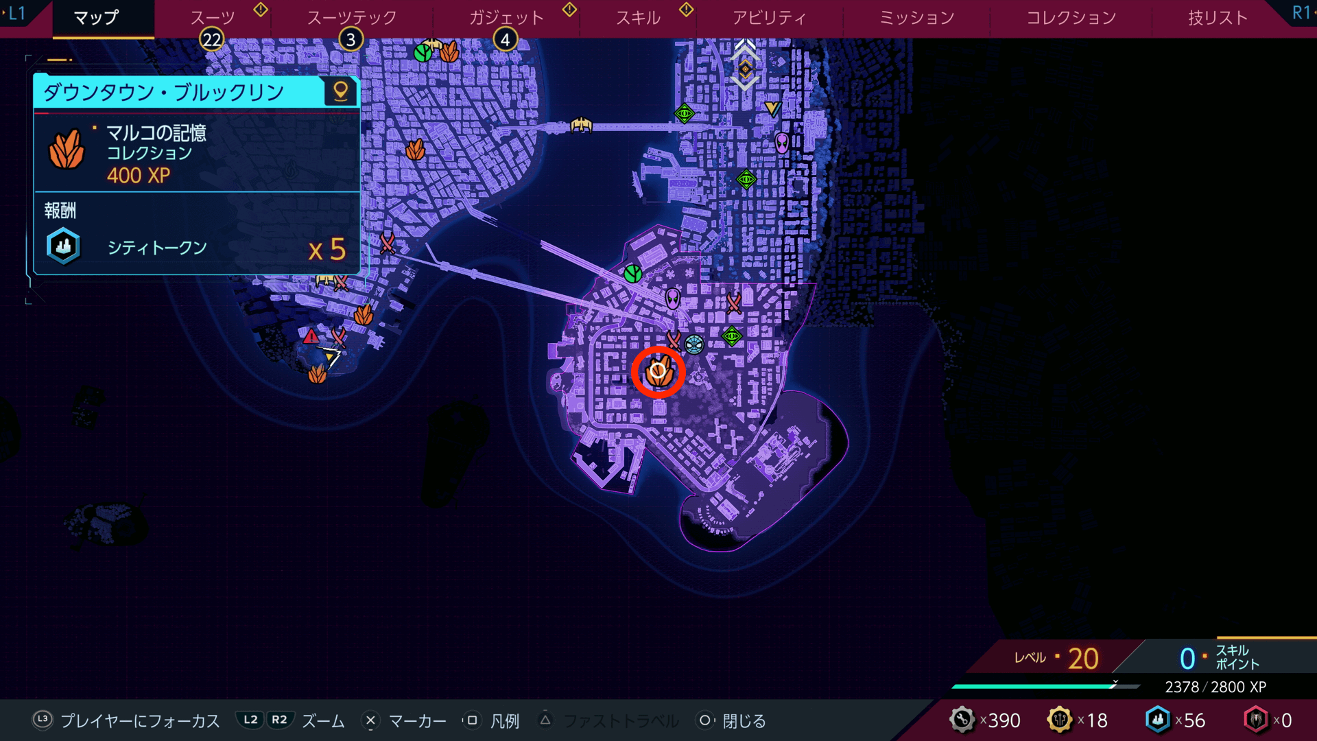 マルコの記憶をクリアすると、1箇所につき400XPとシティトークンを5個入手できる。シティトークンは、スーツテックやガジェットの強化に必要であるため、シティトークンを集めればスパイダーマンを強化可能だ。