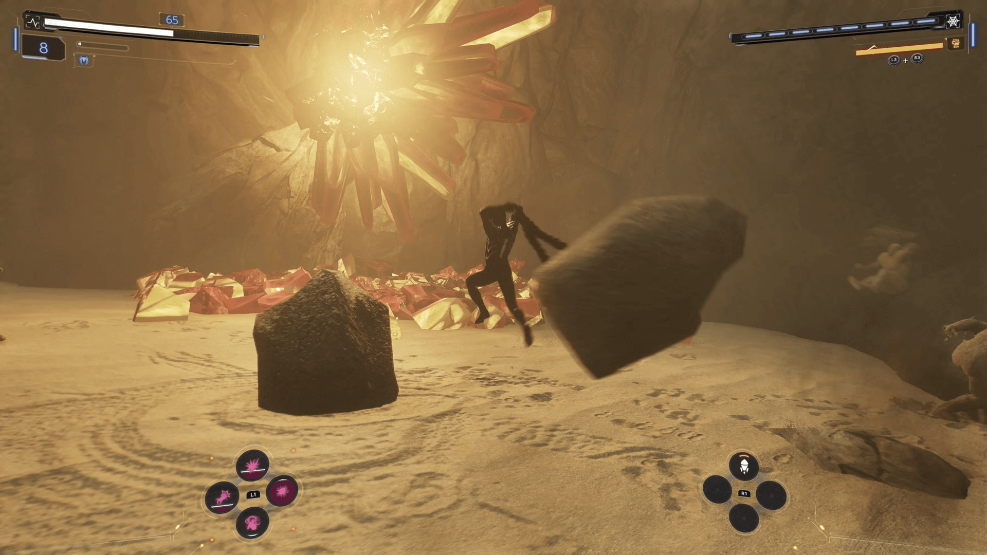 特殊なエリアにワープしたら、奥へ進んで巨大な結晶を破壊しよう。巨大な結晶は、L1+R1で岩を投げてぶつけると破壊可能。小さいマルコを倒す必要は無いため、マルコを無視して岩をぶつけると良い。
