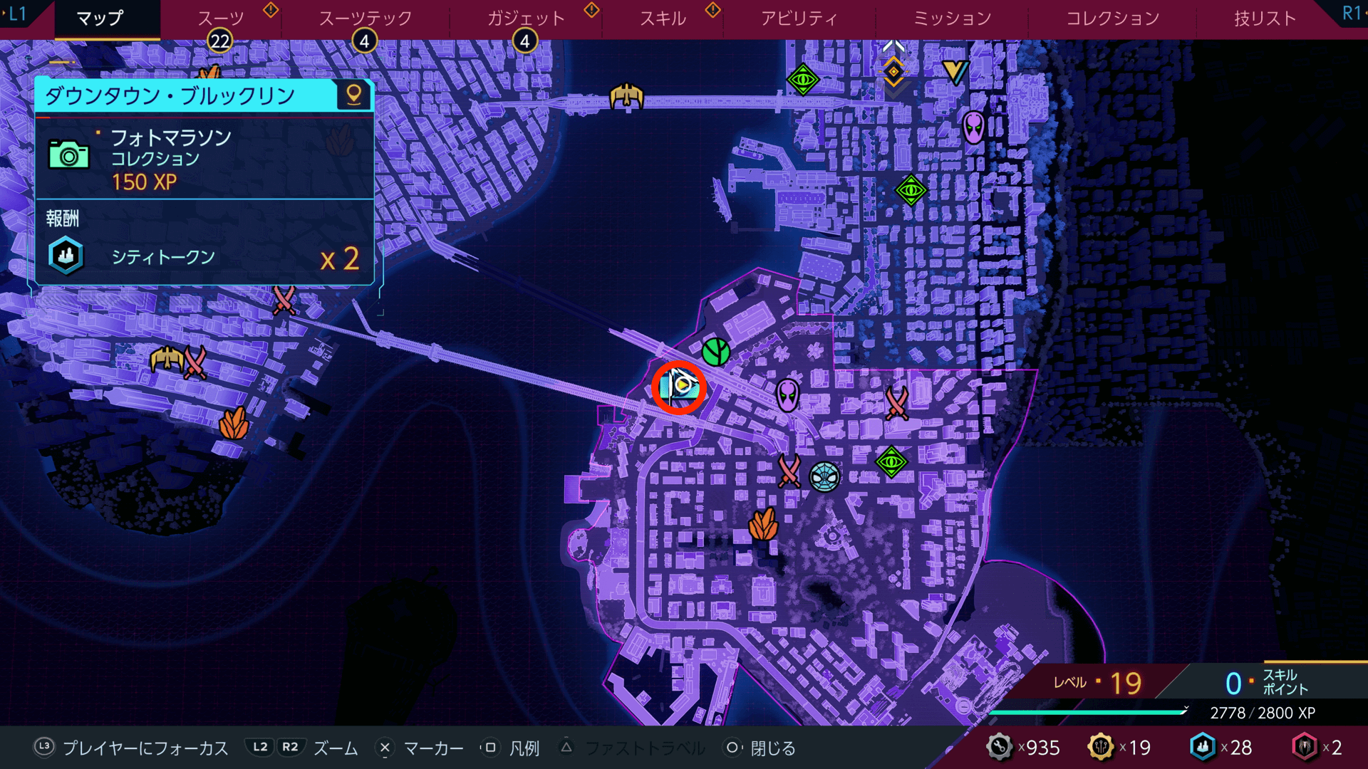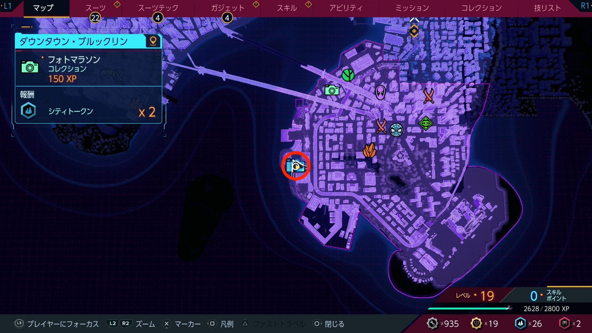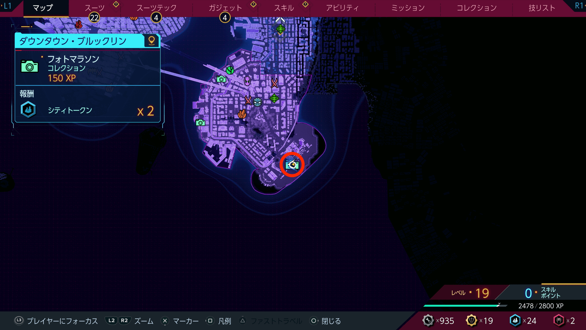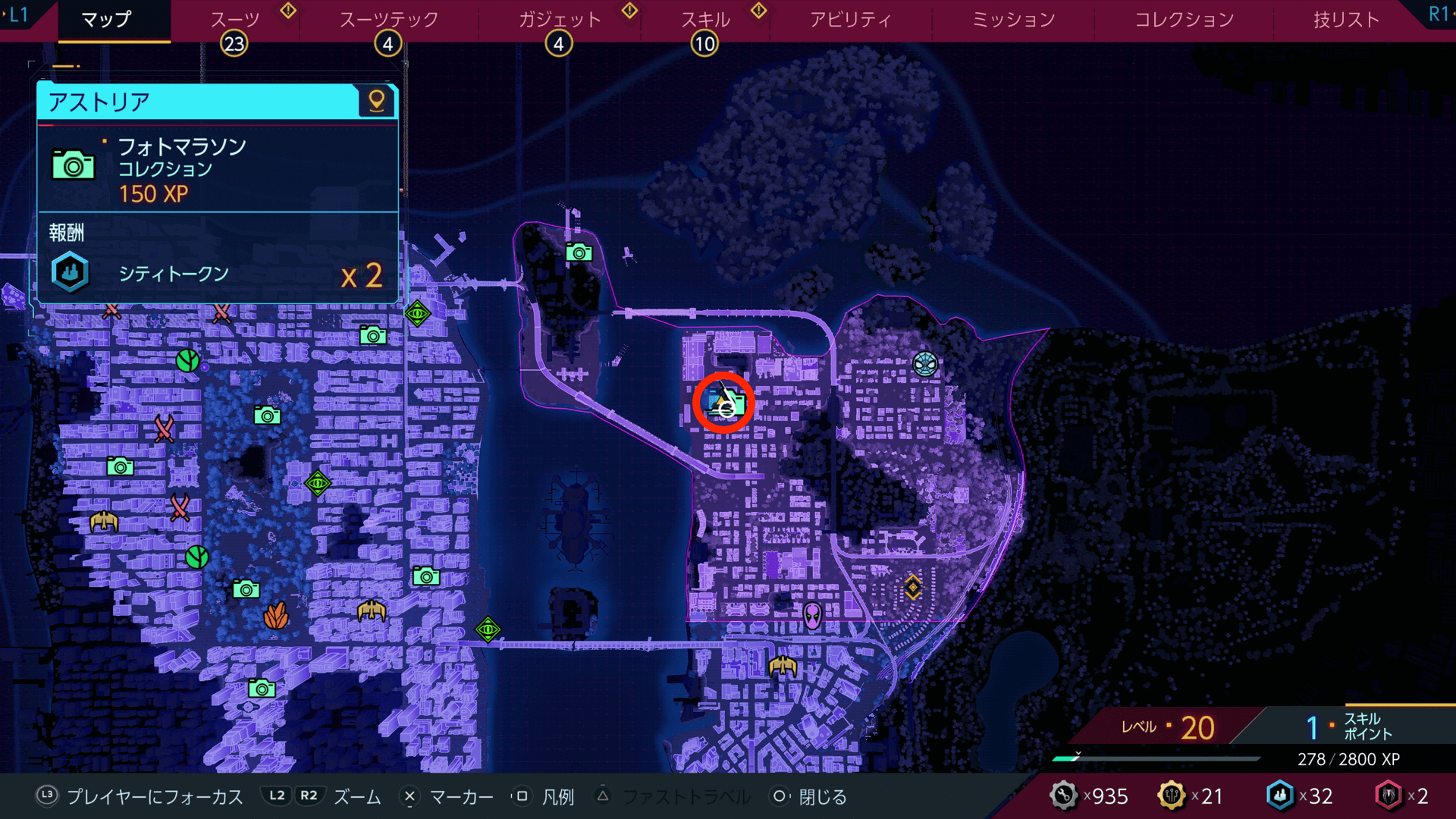 フォトマラソンを完了すると、シティトークンをもらえる。シティトークンは、スーツテックやガジェットなどの強化に必要になるため、撮影箇所があれば積極的に撮っておこう。