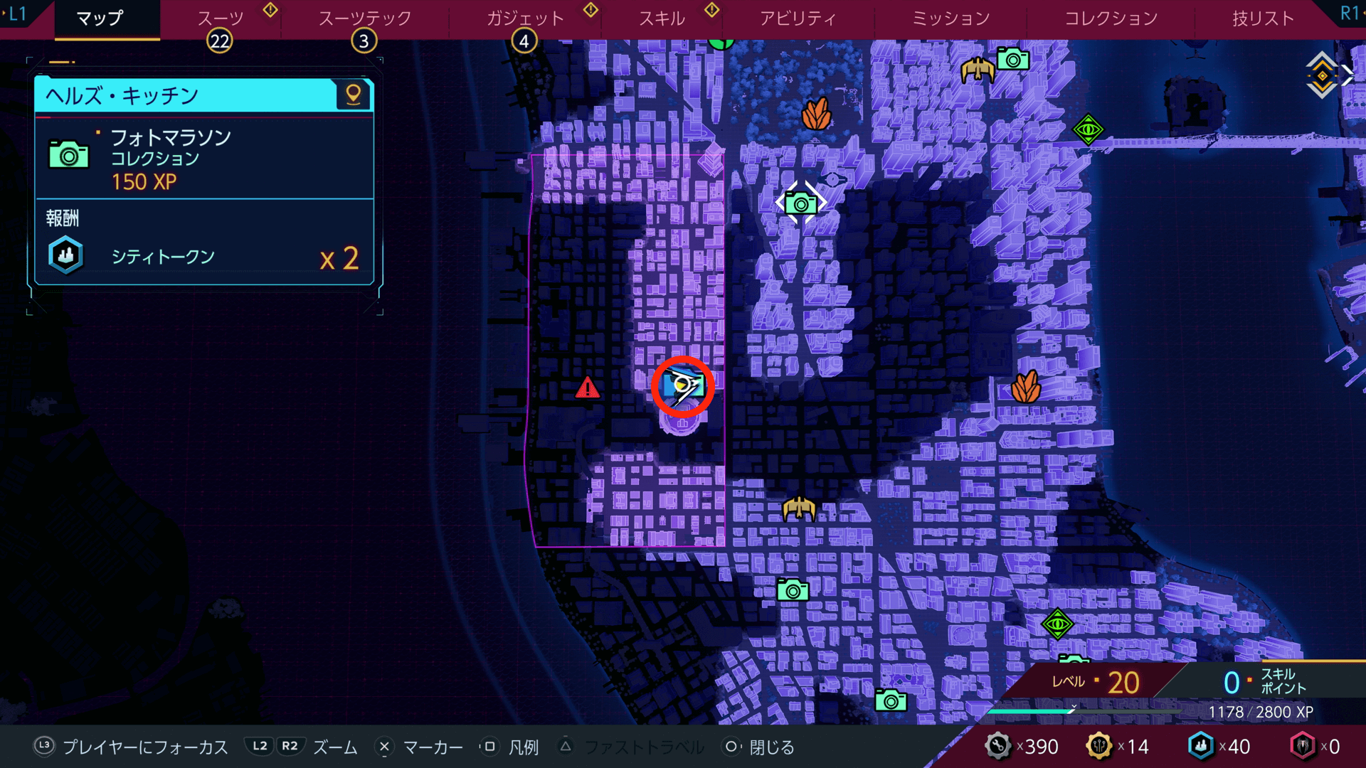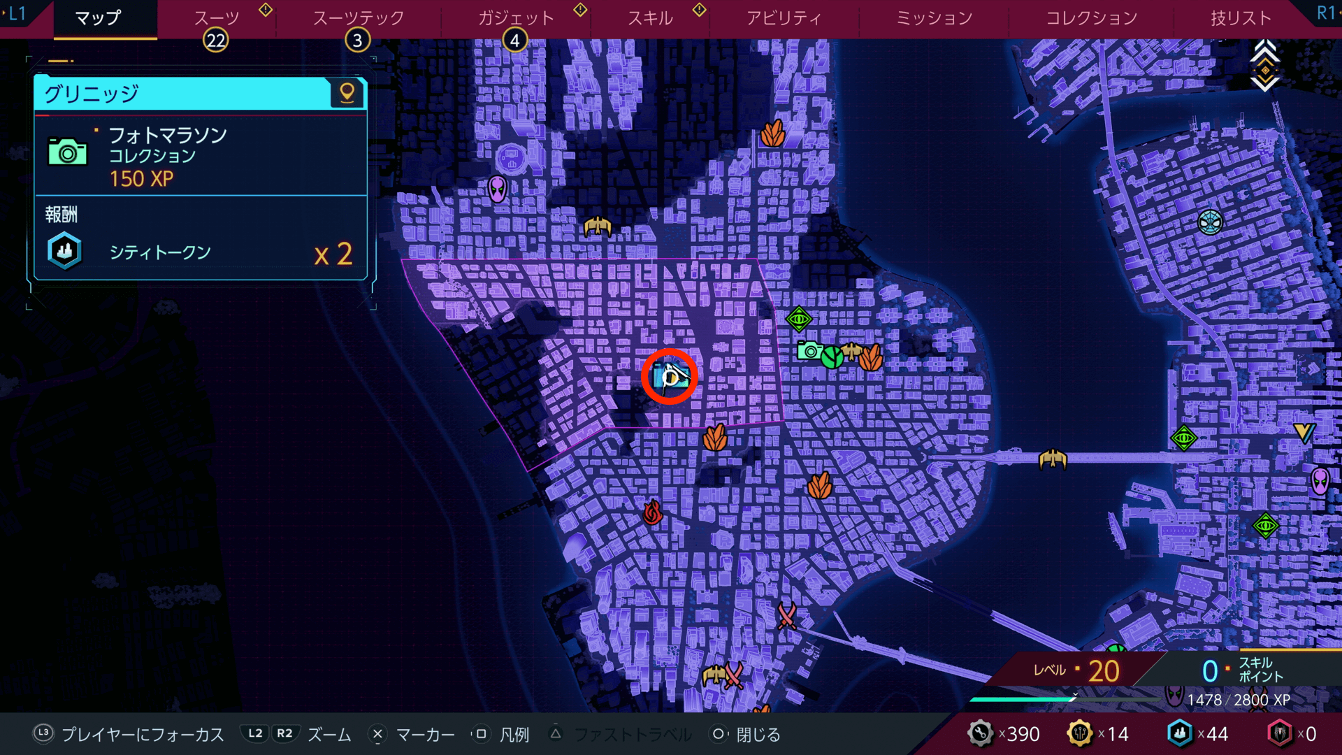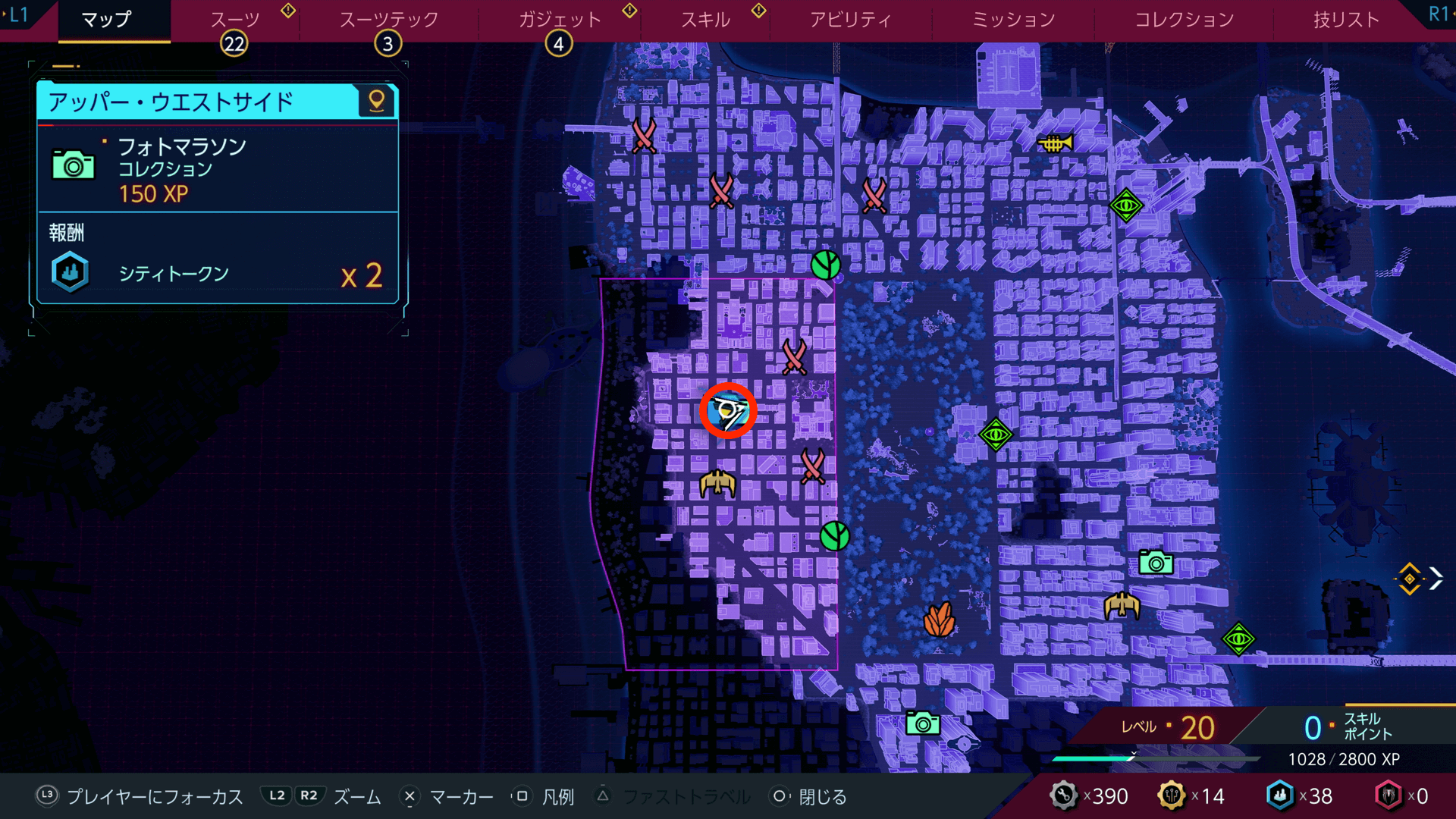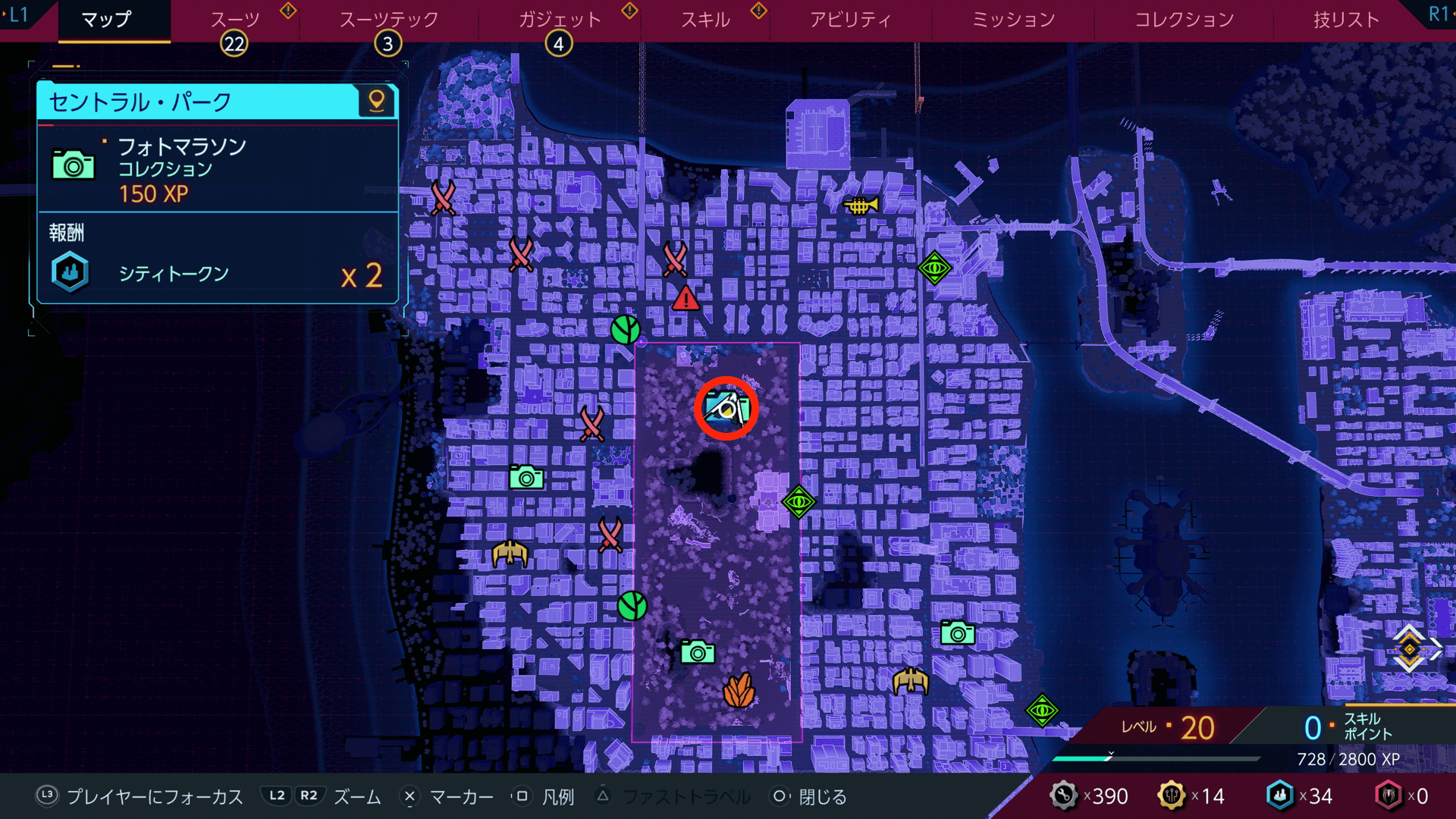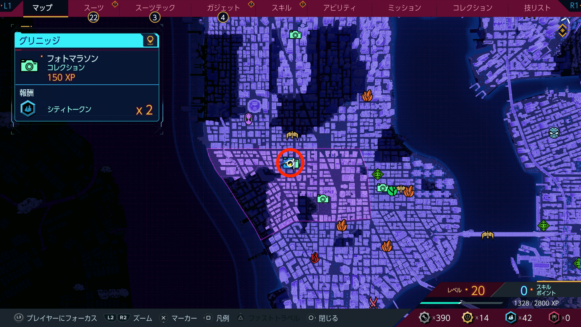 フォトマラソンを完了すると、シティトークンをもらえる。シティトークンは、スーツテックやガジェットなどの強化に必要になるため、撮影箇所があれば積極的に撮っておこう。