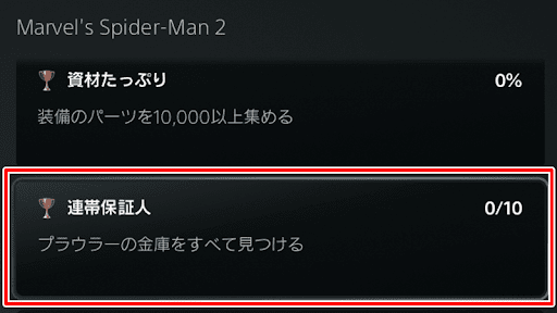 プラウラーの金庫をすべてクリアすると、トロフィー「連帯保証人」を入手できる。トロコンを目指す場合は、プラウラーの金庫もクリアしよう。