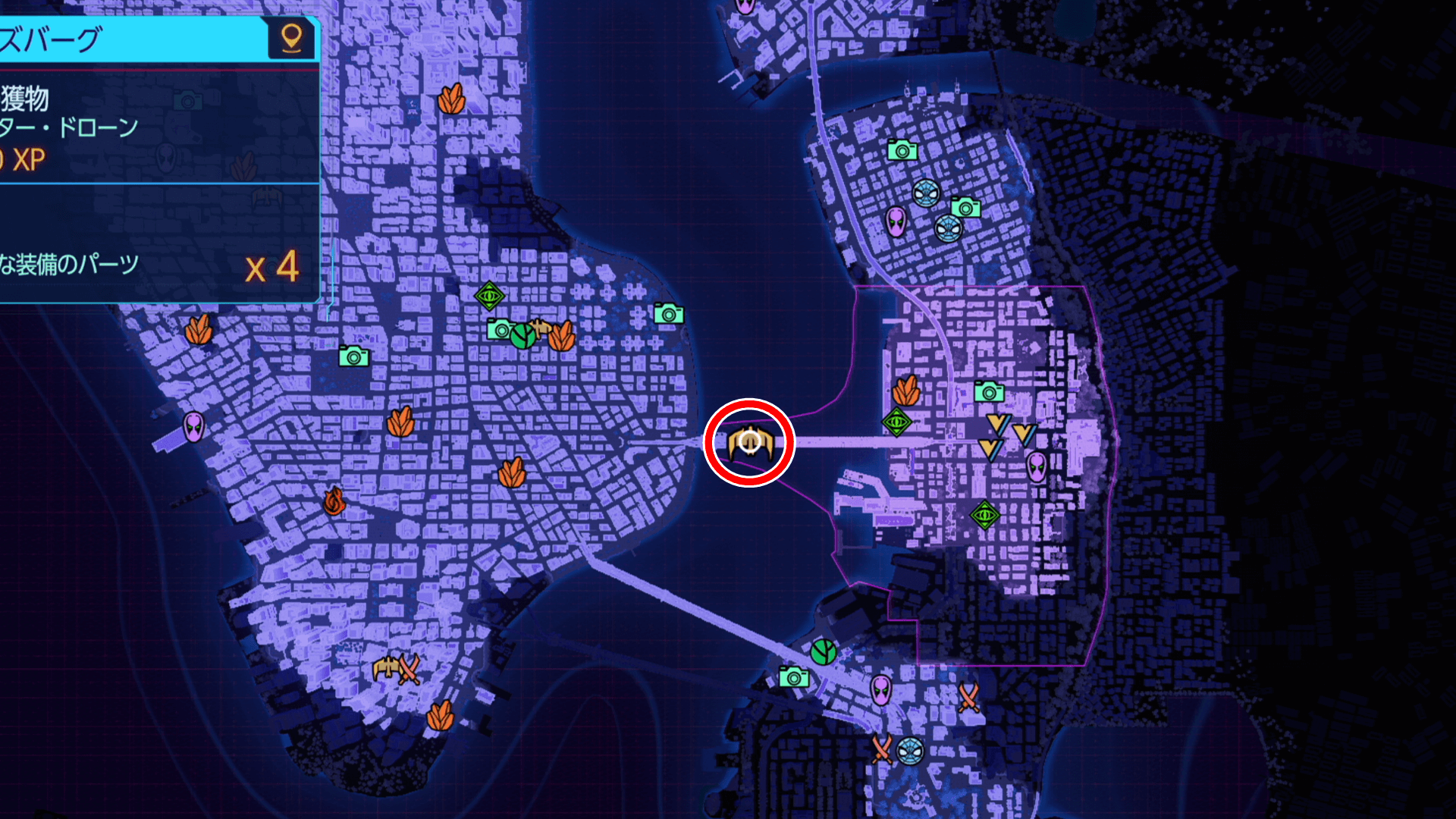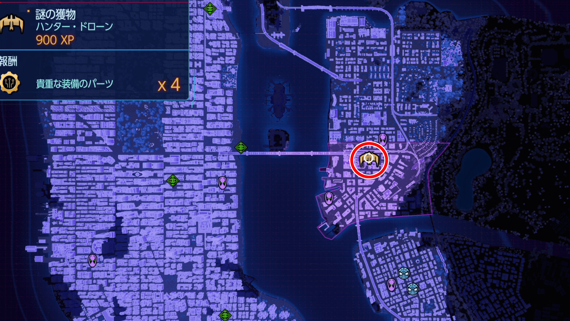 謎の獲物をクリアすると、経験値と貴重な装備のパーツを入手できる。貴重な装備のパーツは、スーツテックやガジェットを強化するのに必要な素材なため、スパイダーマンを強化するためにも見つけたら挑戦しておこう。
