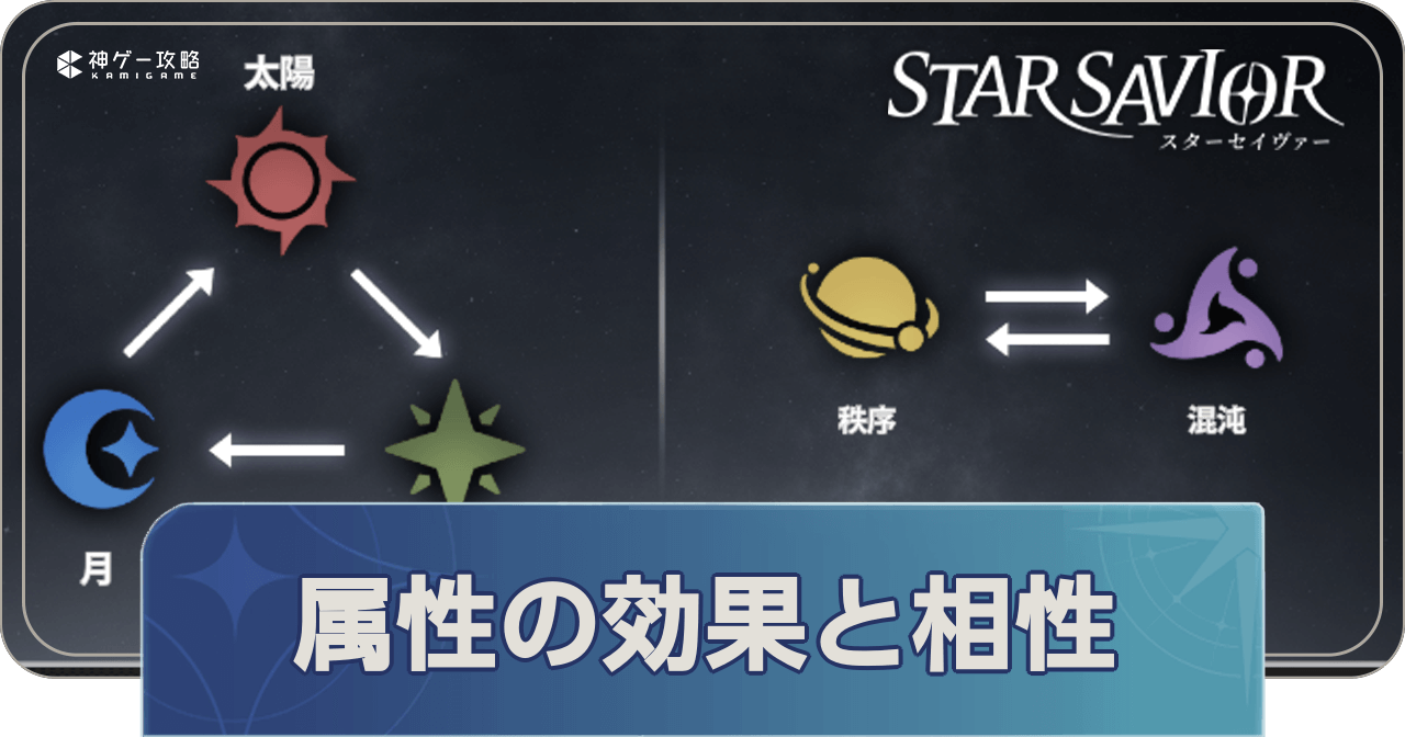 スターセイヴァーの属性は「太陽」「星」「月」「秩序」「混沌」の合計5属性だ。多くのキャラは「太陽」「星」「月」のいずれか割り振られているため、基本的には「太陽」「星」「月」の三すくみの関係だけ意識すれば問題ない。
