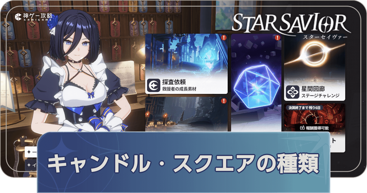 スターセイヴァーのキャンドル・スクエア(キャンペーン)の種類を紹介。キャンドル・スクエアの特徴や探査と討伐貢献ポイントの使い道も掲載しているので、スターセイヴァーでキャンドル・スクエアの種類と特徴について知りたい時の参考にどうぞ。
