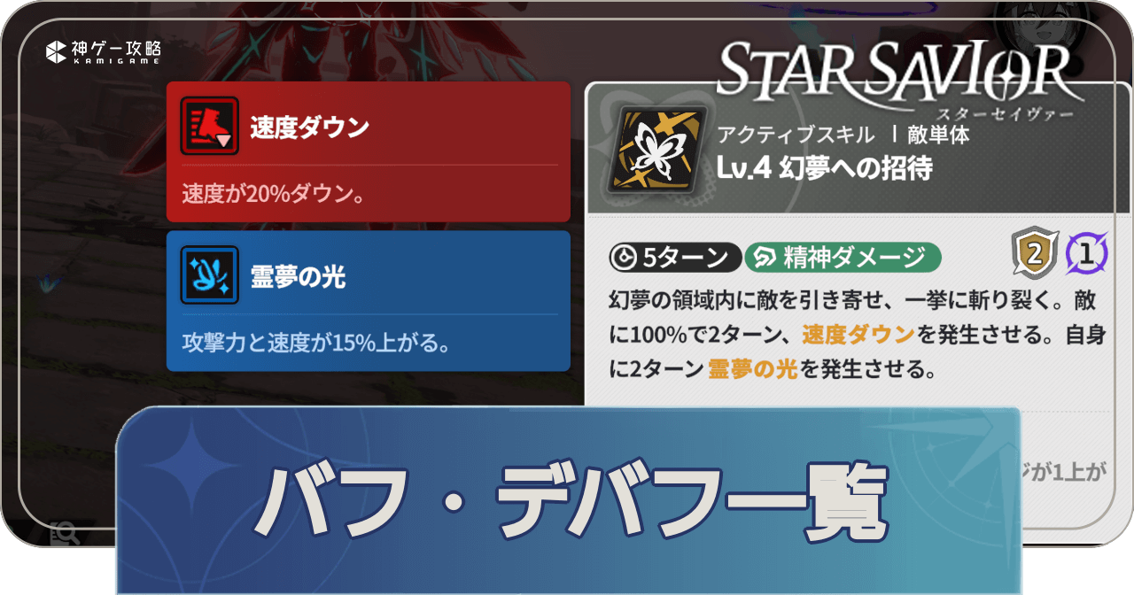 スターセイヴァーのバフ・デバフ検索ツールを掲載。強化・弱体化の一覧や所持キャラ、関連スキルも掲載しているため、スターセイヴァーでバフ・デバフを調べる時の参考にどうぞ。