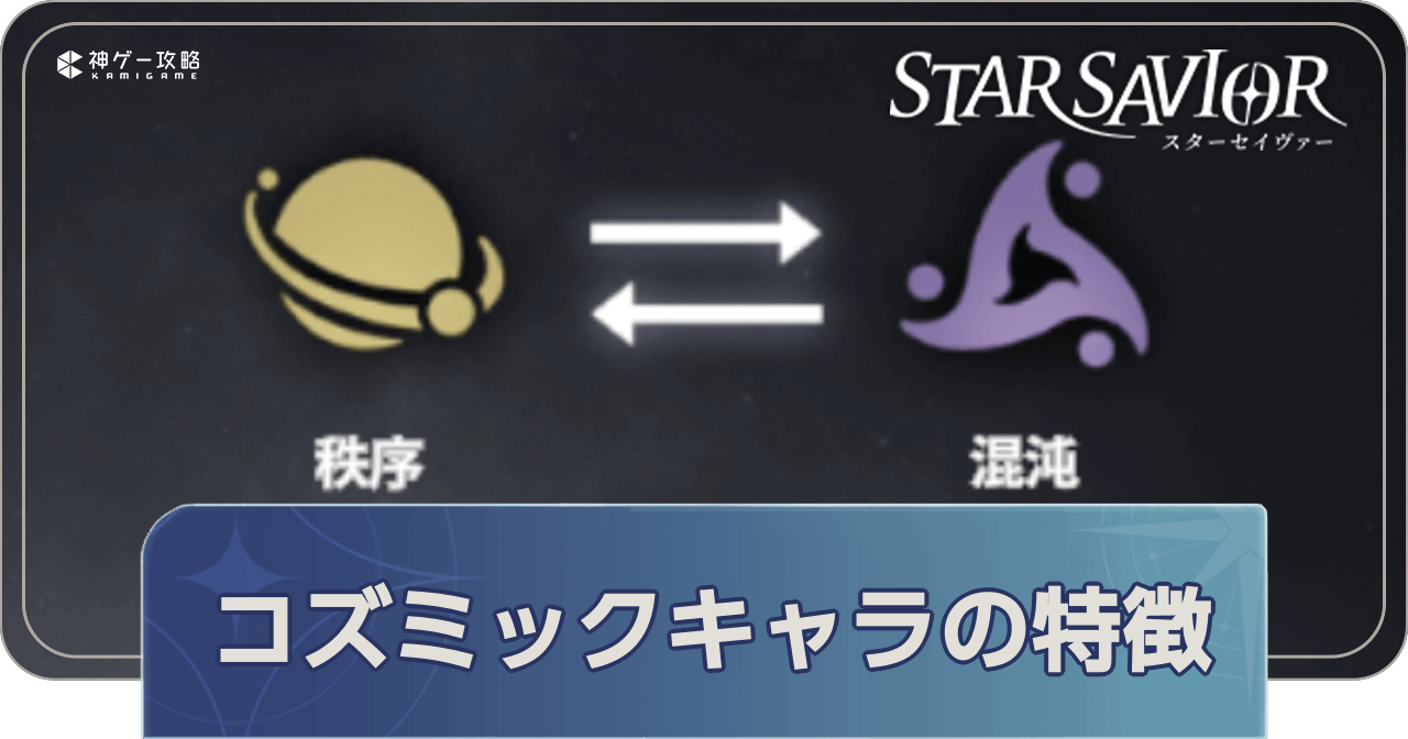 コズミック(COSMIC)キャラとは、混沌属性と秩序属性のキャラを総称した呼び方だ。星・月・太陽属性のキャラとは異なる特性を持っており、全体的に性能が高く、強力なキャラが多いのが特徴となっている。