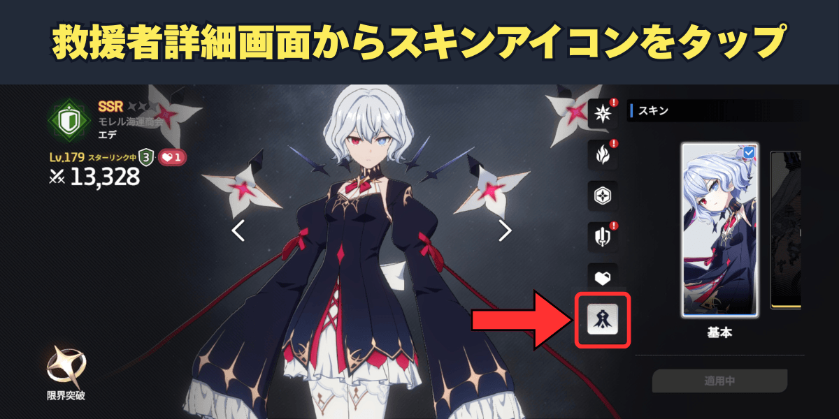 スキンを変更する場合は、救援者の詳細画面からスキンアイコンをタップしよう。変更したいスキンを選択して適用すれば、スキンの変更が完了する。