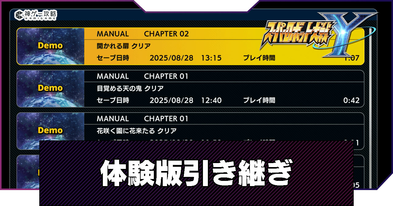 スパロボYの「体験版の引き継ぎ」を解説。スーパーロボット大戦Y体験版の引き継ぎ方法に加えて、引き継ぎで貰える特典と、引き継がれる要素について掲載しています。