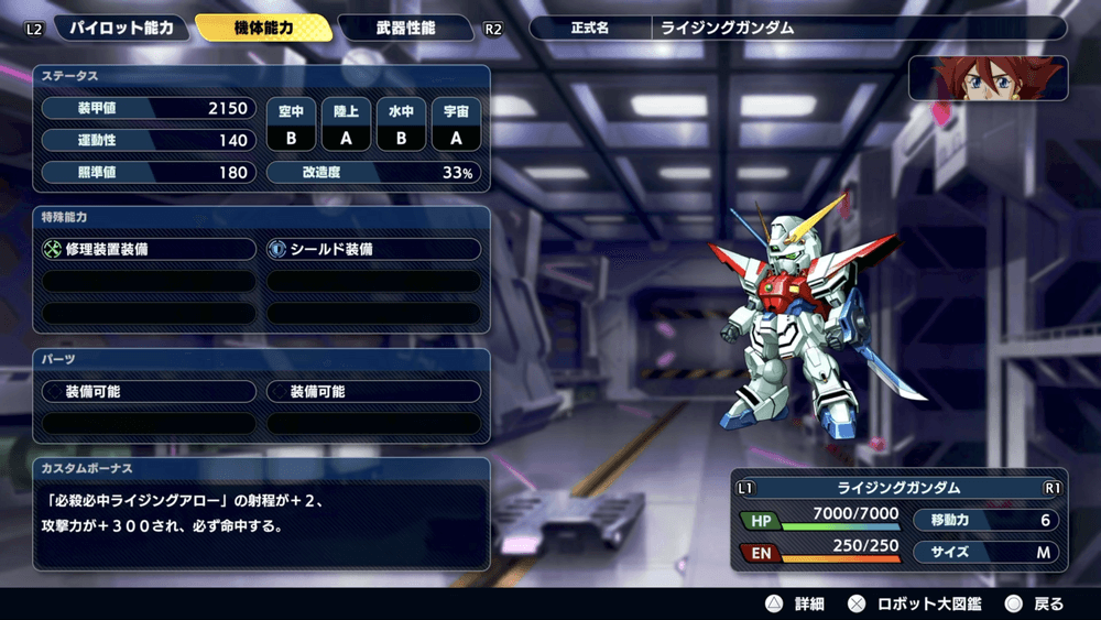 | 精神コマンド | 集中 20 信頼 30 不屈 20 必中 20 激励 20 愛 50 |