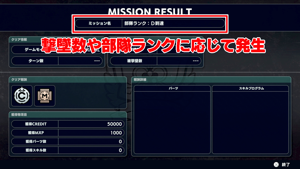 部隊ランクの上昇や、撃墜総数を記念したトークミッションでは、大量のクレジットやMXPが獲得できる。ただし、入手タイミングは各トークにつき一回限りになるため、安定して稼ぐ場合はバトルミッションや全滅プレイを活用しよう。