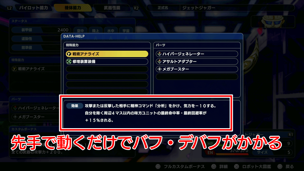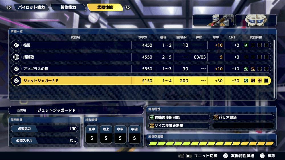 | ・最大HP+1000 ・最大EN+40 ・運動性+15 ・照準値+15 ・装甲値+200 ・移動力+1 ・全ての武器の攻撃力+200 |
