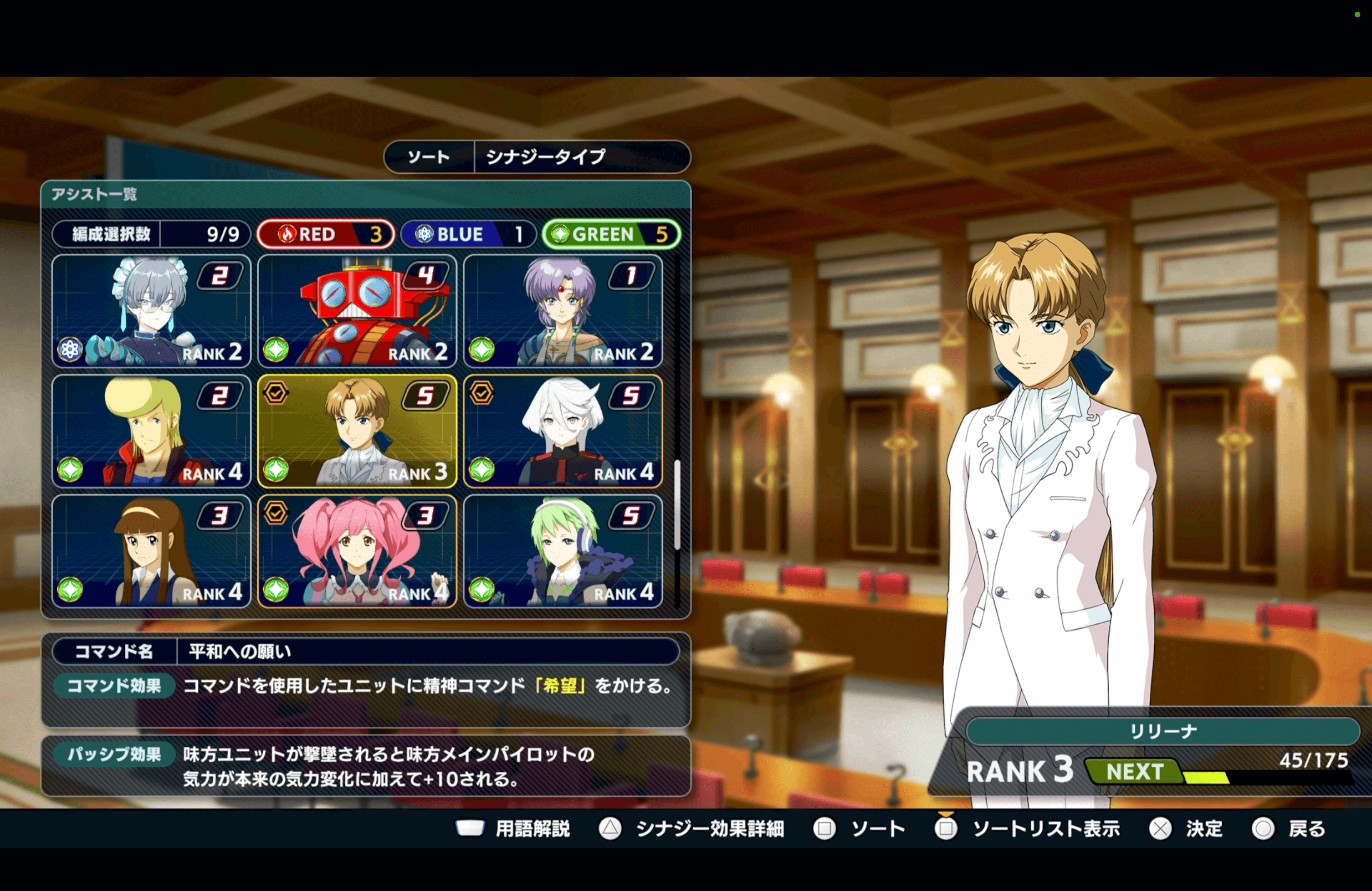 ・範囲への努力と幸運かけが優秀 ・最大SP上昇も汎用的で使いやすい ・終盤は精神コマンドで代用可能 |