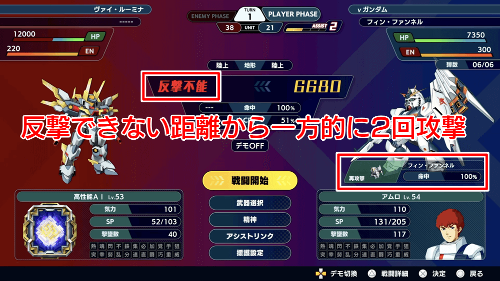 νガンダムはフィンファンネルの射程が長く、加えてアムロの再攻撃による2連続攻撃が極めて強力な攻撃手段となる。アムロ自身の技量値が非常に高いため、ボス含めてほぼ全ての敵に再攻撃を含めた大ダメージを与えられる。