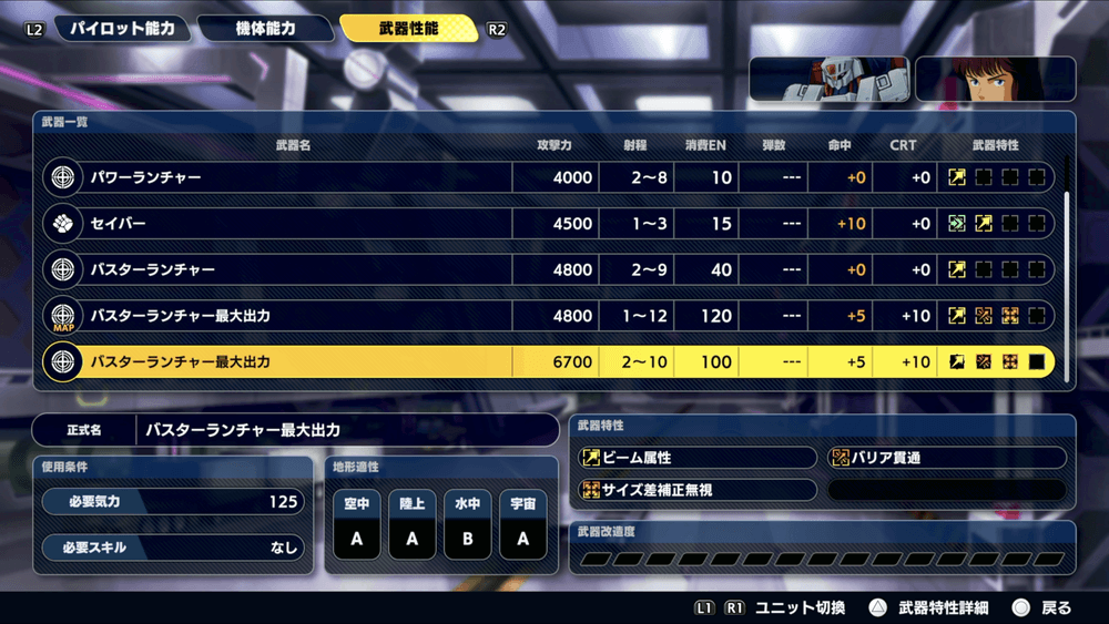 | ・全ての武器の攻撃力+200 ・パイロットの気力130以上で照準値・運動性+25 |