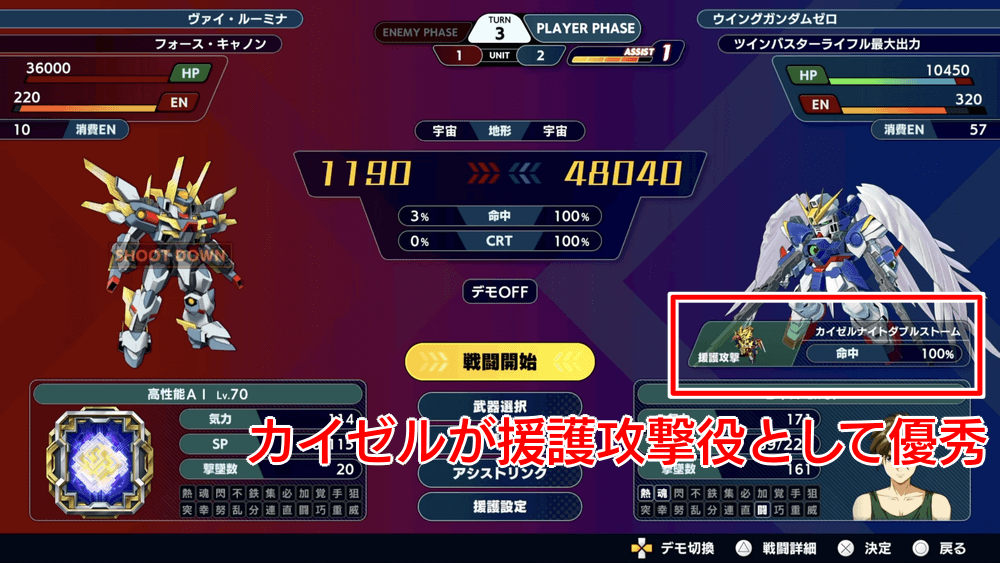 | 敗北条件 | 味方の全滅、または指定エリア内へのルーミナの侵入 一回の攻撃でヴァイ・ルーミナを撃墜できなかった場合 4ターン目を迎える |