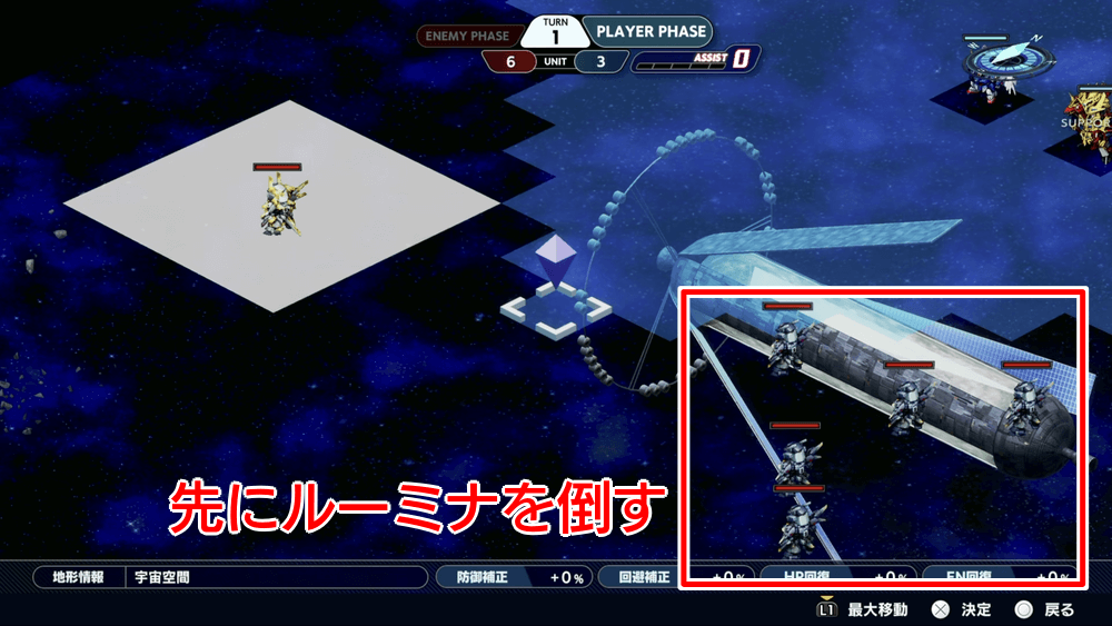 目標地点にルーミナが侵入すると敗北になるため、まずはマップ東側にいるルーミナを撃墜しよう。ルーミナはこちらを一切攻撃しないため、初手で倒せない場合は精神コマンドを使って撃墜まで持ち込もう。2ターン目までに全滅できない場合は火力不足のため、機体を強化してから再挑戦すると良い。