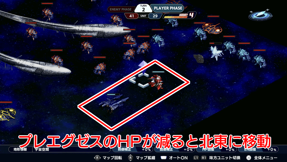 宇宙に咲く花で第一勝利条件を満たすと「プレエグゼス専用機動兵装」が出現し、HPを減らすとレッドファイブとマクロスが北東に移動してしまう。移動位置が敵部隊に囲まれやすく、無策で条件を満たすと敗北に繋がる。事前に周りの敵を倒すか、部隊全員を北東に寄せておき、孤立を防ぐのがおすすめだ。