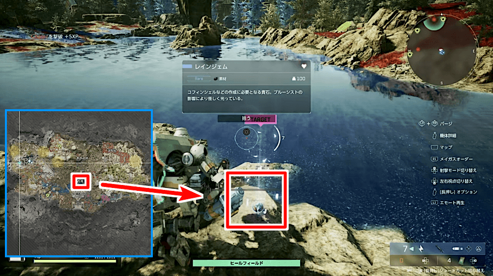 レインジェム系の素材は群青湖の小島や、農耕プラントのタンク周辺に配置されている区間で拾える。見つかっても1〜2個なため、何度も通って数を集めよう。同じ場所で、運が良ければ「高純度レインジェム」も見つかる。