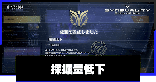 シンデュアリティ(SYNDUALITY Echo of Ada)の協会依頼「採掘量低下」を解説。依頼の攻略手順はもちろん、報酬や解放条件についても掲載しているので、シンデュアリティをプレイする際の参考にどうぞ。