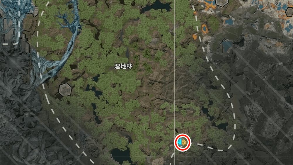 マップ 外観 怪しげな粉を回収したら、湿地林の解錠キーを使って扉を開けよう。解錠する際はメイガスが離れるため、周囲の安全を確保してから解錠を行うのがおすすめだ。