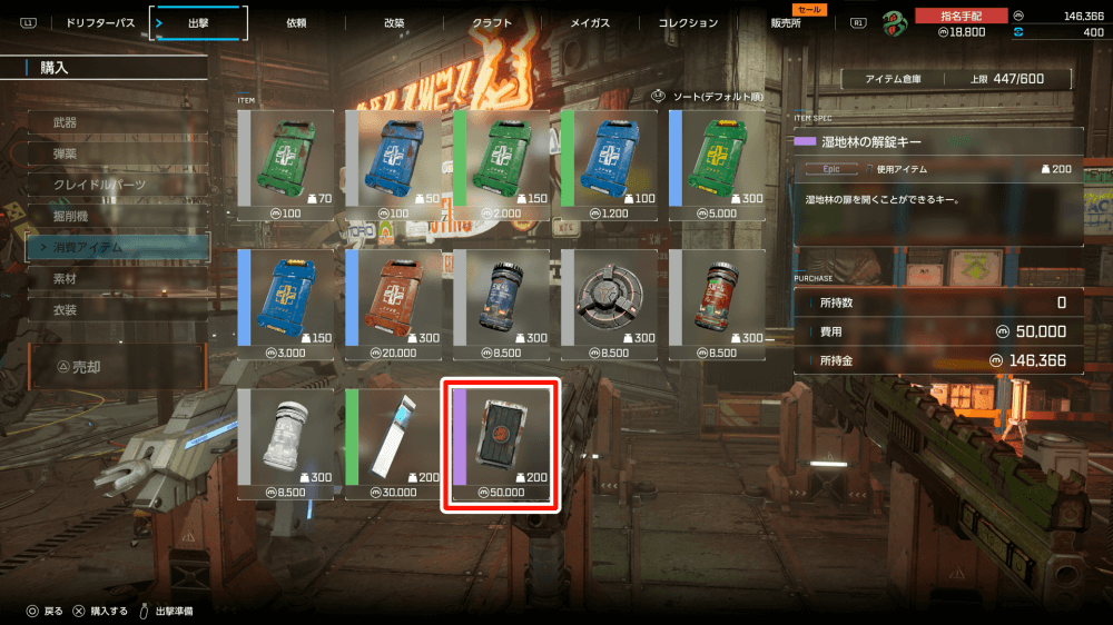 まずは、ショップに追加された湿地林の解錠キーを1個購入しよう。解錠キーは重さ200とジャックボディのセーフポケットに入らないため、アンコモン以上のクレイドルで出撃し、使用するまではセーフポケットに入れておくのがおすすめだ。
