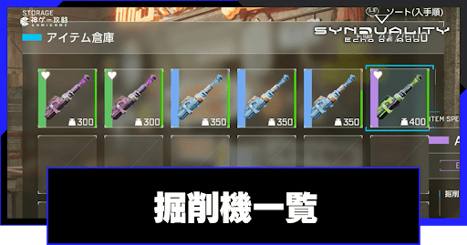 【シンデュアリティ】掘削機一覧 編集者 シンデュアリティ攻略班 最終更新日 2025/04/14 19:19 シンデュアリティ(SYNDUALITY Echo of Ada)の掘削機を解説。掘削機の性能を一覧で掲載しているので、シンデュアリティをプレイする際の参考にどうぞ。 パーツ一覧 ボディ アーム レッグ 掘削機 掘削機一覧 AO結晶掘削機コモン203001000効果・緑ゲージまでのAO結晶を掘削できる AO結晶掘削機+1アンコモン303005000効果・青ゲージまでのAO結晶を掘削できる AO結晶掘削機+2レア403504000効果・紫ゲージまでのAO結晶を掘削できる AO結晶掘削機+3エピック504003000効果・黄ゲージまでのAO結晶を掘削できる