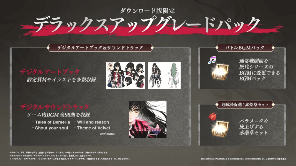 有料DLCには、デラックスエディションの特典を購入できるアップグレードパックがある。アップグレードすると、アートブックやサウンドトラックなどのグッズのほか、パラメータを上げる赤薬草セットを入手可能だ。薬草を使ってキャラのパラメータを強化し、ゲームを有利に進めよう。