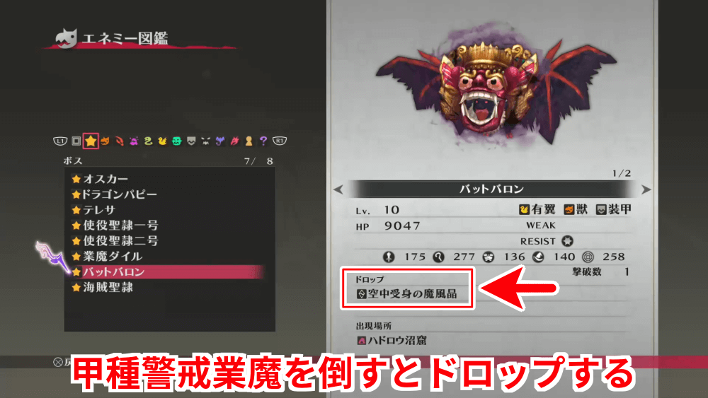 魔水晶は、各地に存在する甲種警戒業魔を倒すと入手できるものもある。甲種警戒業魔は、黒い霧をまとった特殊な姿でフィールドやダンジョンを徘徊しており、同じエリアに出現する他の敵よりも強い。撃破しないかぎり同じマップに出現し続けるため、すぐに倒せない場合は後回しにして問題ない。