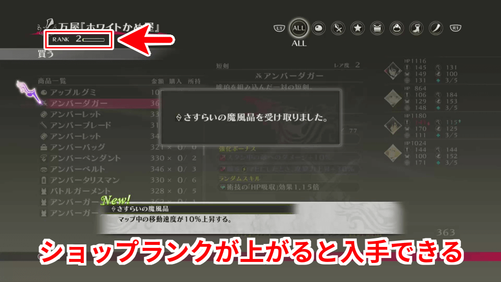 魔水晶は、ショップランクの達成報酬でも入手できる。ショップランクは、ショップで購入と売却を行なった金額に応じて上昇するため、ショップを利用していれば自然と上がっていく。また、ショップランクはすべてのショップで共通のため、売買する場所にこだわる必要はない。