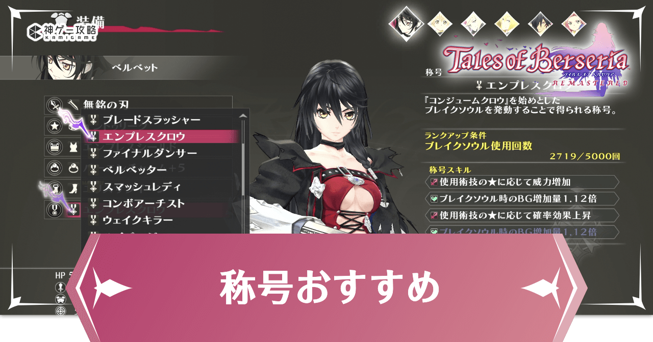 テイルズオブベルセリアリマスター(ToB)の「おすすめ称号」について解説。キャラごとの装備おすすめ称号や効果、称号の活用方法についても掲載しています。