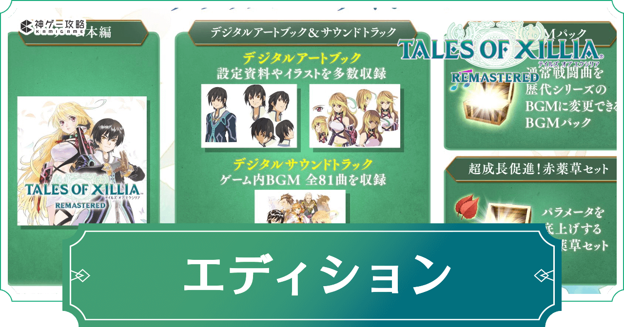 テイルズ オブ エクシリアの「エディション」を解説。エクシリアリマスターのエディションごとの違いや特典一覧、購入の注意点について掲載しています。