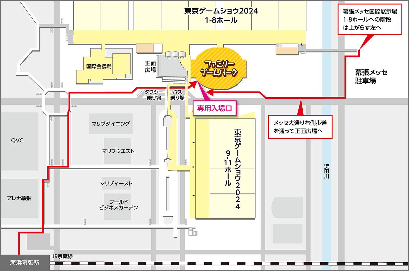 「ファミリーゲームパーク」には幕張イベントホール1階の専用入場口から入場しよう。最寄り駅であるJR京葉線「海浜幕張」駅から徒歩で向かうと迷いづらいためおすすめだ。